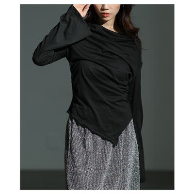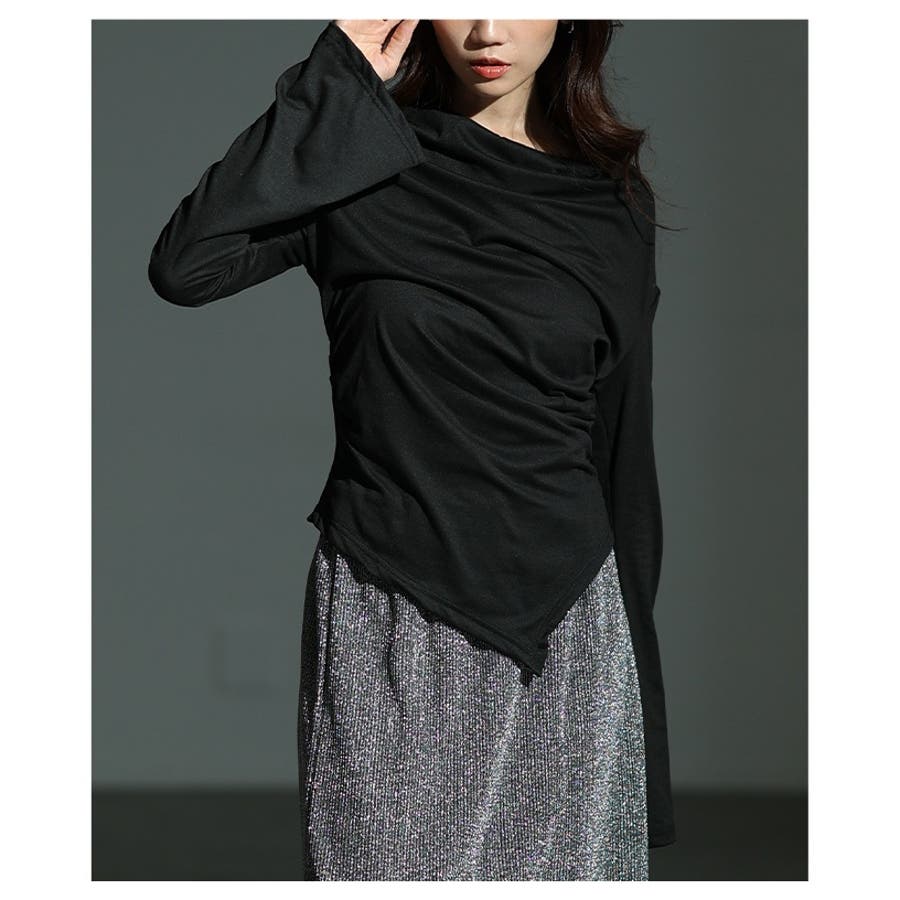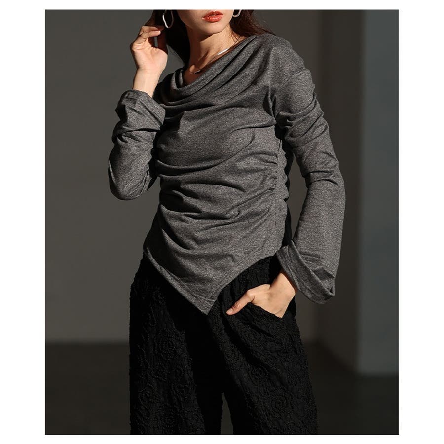 裾がアシンメトリーになったイレギュラーヘムカットソーです。首元は今季のトレンドであるドレープデザインのボートネックで顔周りをすっきりとした印象に。両サイドのシャーリングは細見えです◎長めに設定してあるベルスリーブはモードな印象を加速させます。