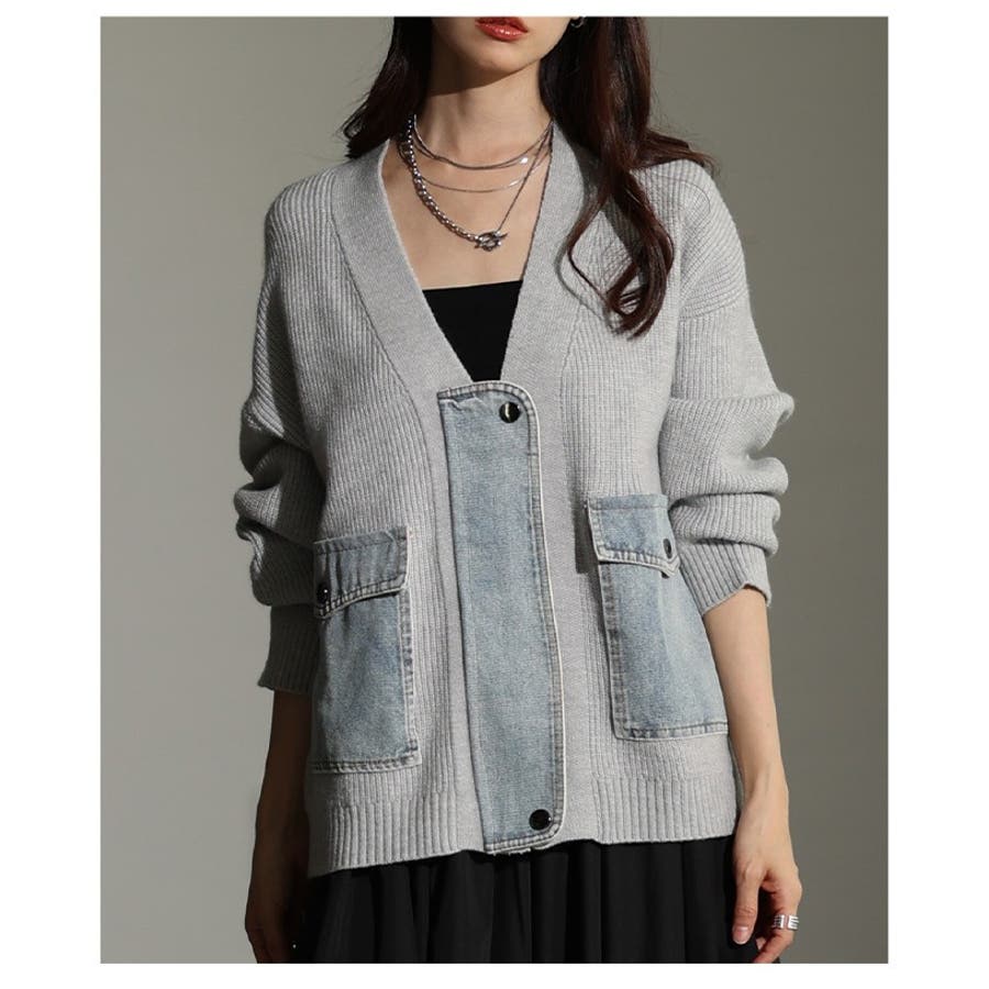 周りと差を付ける異素材デニム×リブニットカーディガン レディース ファッション