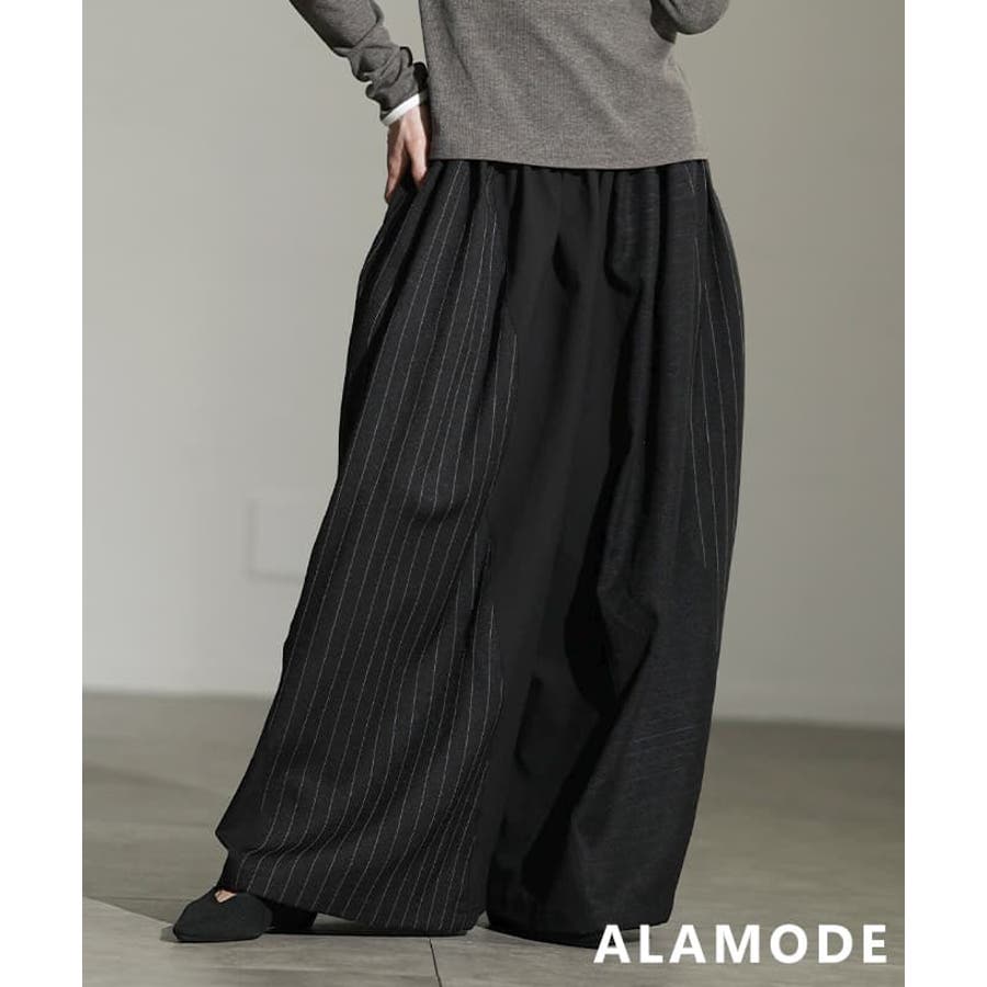 ストライプ生地を切り替えたデザインが目を惹くワイドパンツ。