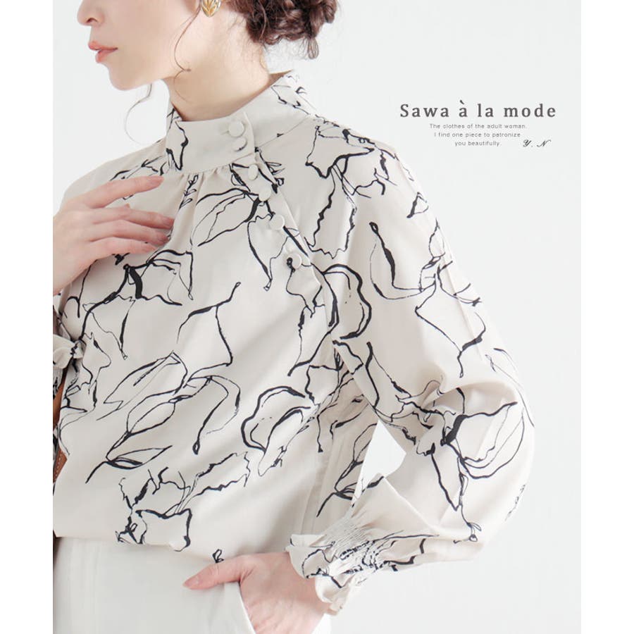 アートな花が目を惹くスタンドネックブラウス レディース ファッション