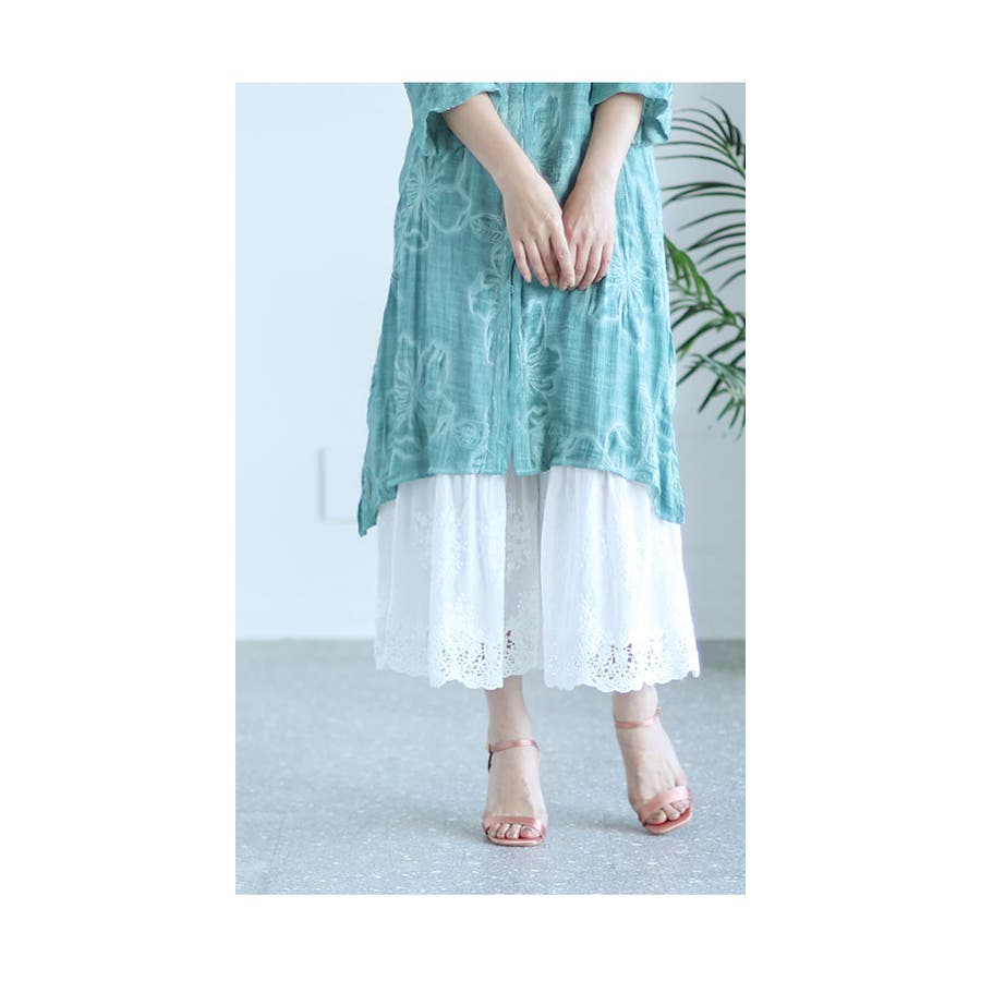 パンツ丈は足首丈です。ウエストは総ゴム入りで、とても楽に履けました。汗を吸収してくれるコットン100%で、サラッとした肌触りでした。ワイドシルエットで、膝上からギャザー切り替えでふんわりボリューム感が出ます。裾はスカラップ仕立ての刺繍とレースで透け感を出し、軽やかな印象です。股上は深めで、伸ばすと胃の辺りまでありました。充分なワイドがあるので、しゃがむなどの動きもとても楽でした。ワンピースとのコーデに、一枚あると秋口まで活躍してくれそうですね。