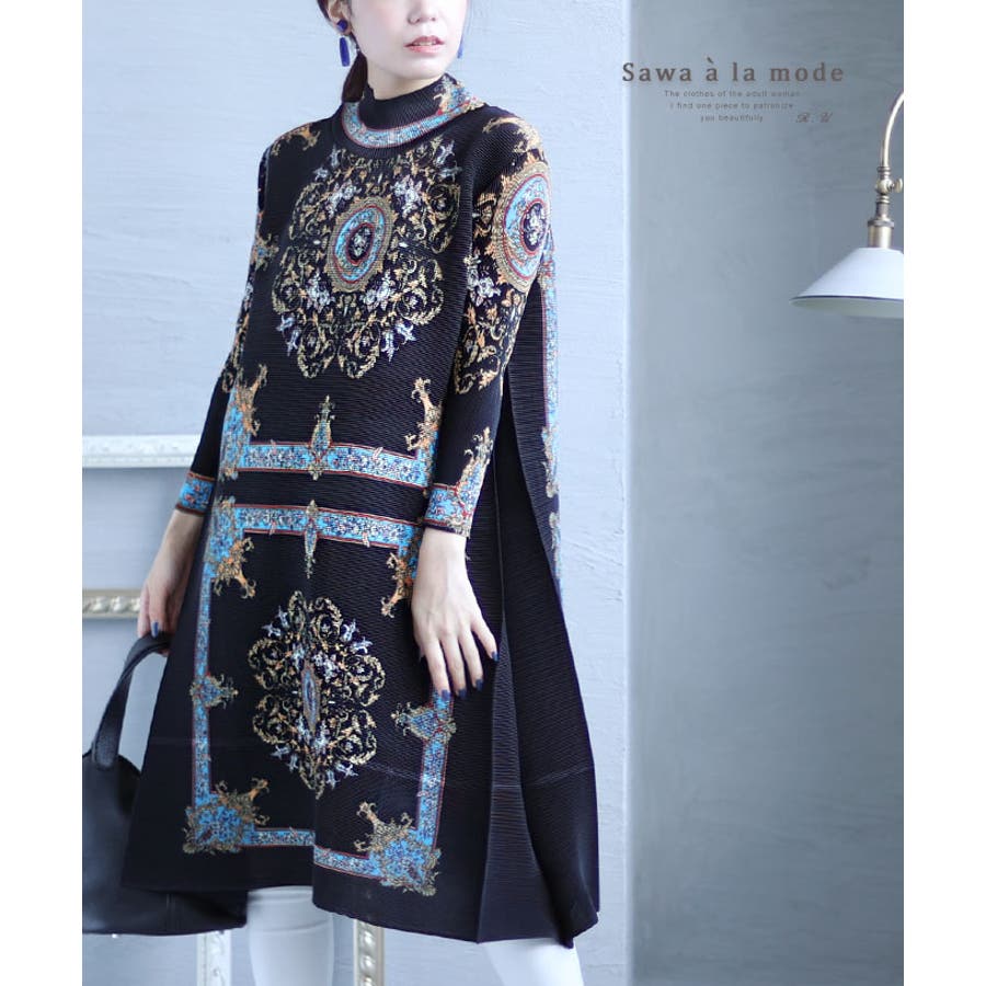 艶やかなスカーフ模様のアコーディオンプリーツチュニック レディース ファッション