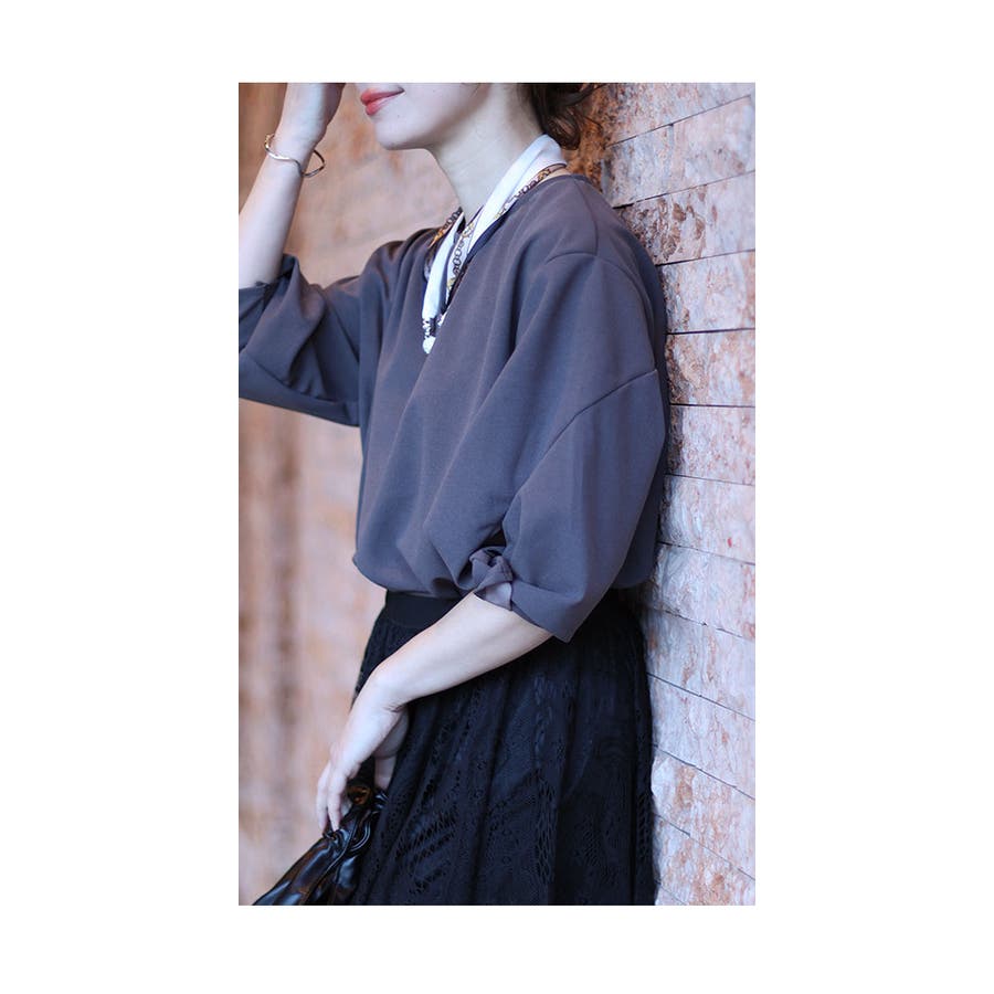 着丈はヒップが隠れるくらい、袖丈は七分袖です。サラッとした肌触りで程よい厚みがあり、透け感はありません。ブラウス見えする生地ですがストレッチが効き、全体にゆったりしていてとても楽に着られました。首元はラウンドネック、袖口のねじりデザインがアクセントです。