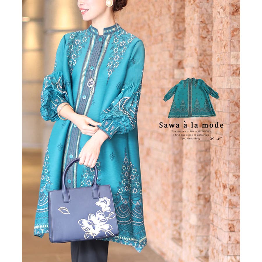 オリエンタル柄に花が咲くふんわり袖プリーツチュニック レディース ファッション
