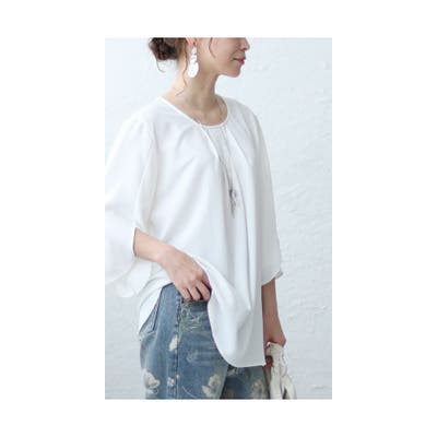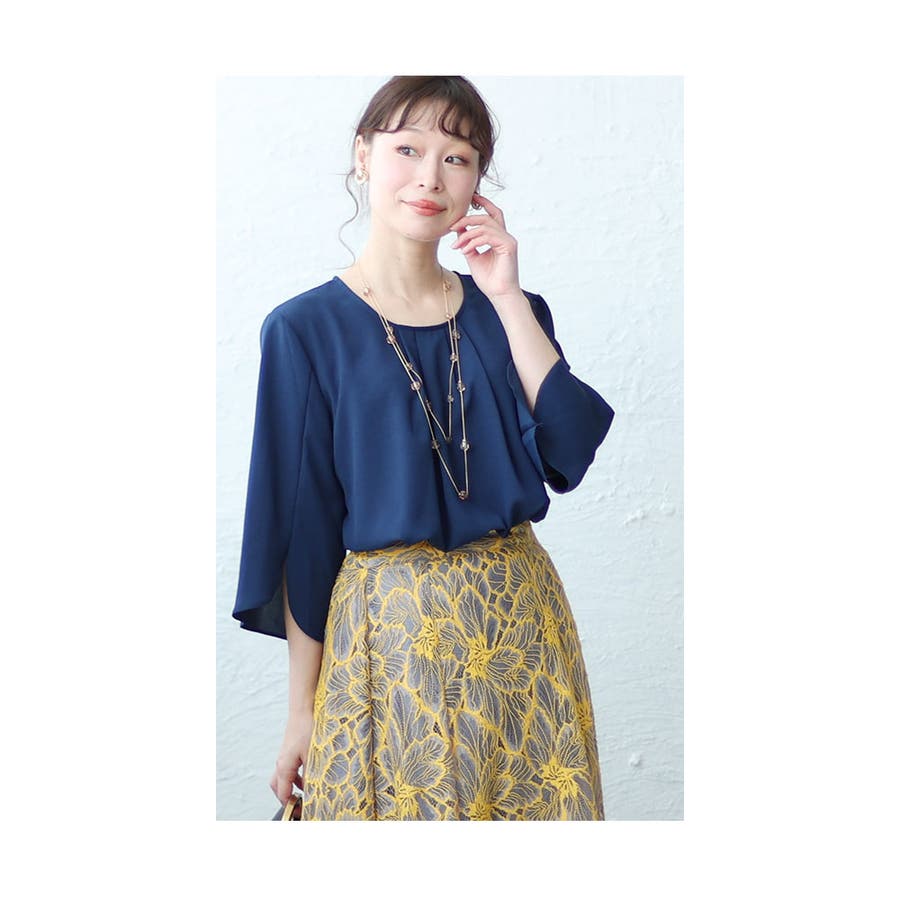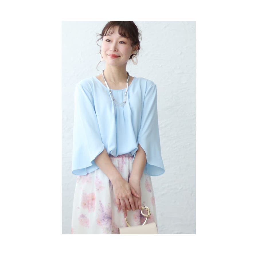 着丈はヒップが隠れるくらい、袖丈は七分袖です。胸元にタックを寄せ、ふんわりゆったりしたシルエットで楽な着心地のチュニックブラウスです。生地はサラッとした肌触りで、少し伸縮性がありました。袖は裾広がりのトランペットスリーブで内側にスリットが入っています。首元は程よい開きぐりでインナー見えの心配もなく、アクセサリーも合わせやすいです。後ろボタン付きですが、ボタンを外さなくてもそのまま被って着用できました。淡色はやや透けるのでインナーに気をつけてください。