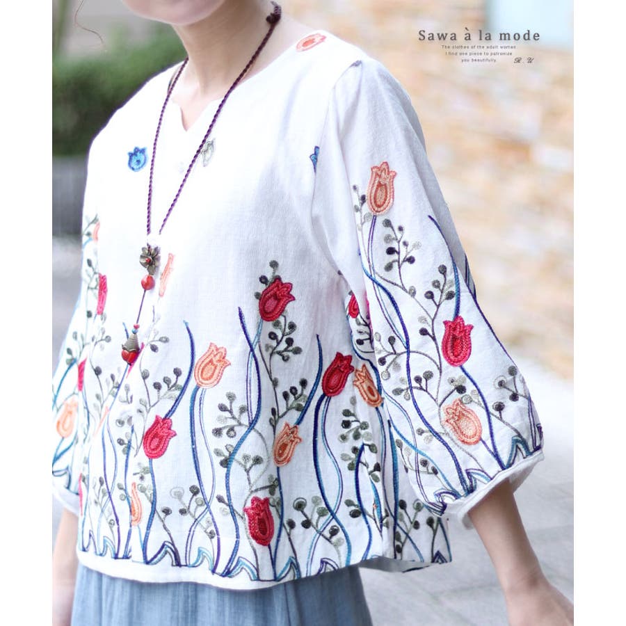 艶やかなチューリップ畑の刺繍シャツブラウス レディース ファッション