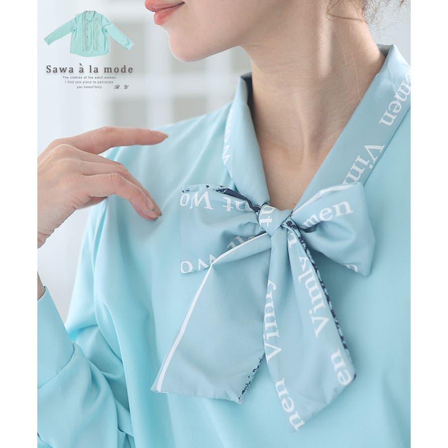 爽やかブルーが目を惹く英字ロゴボウタイブラウス レディース ファッション