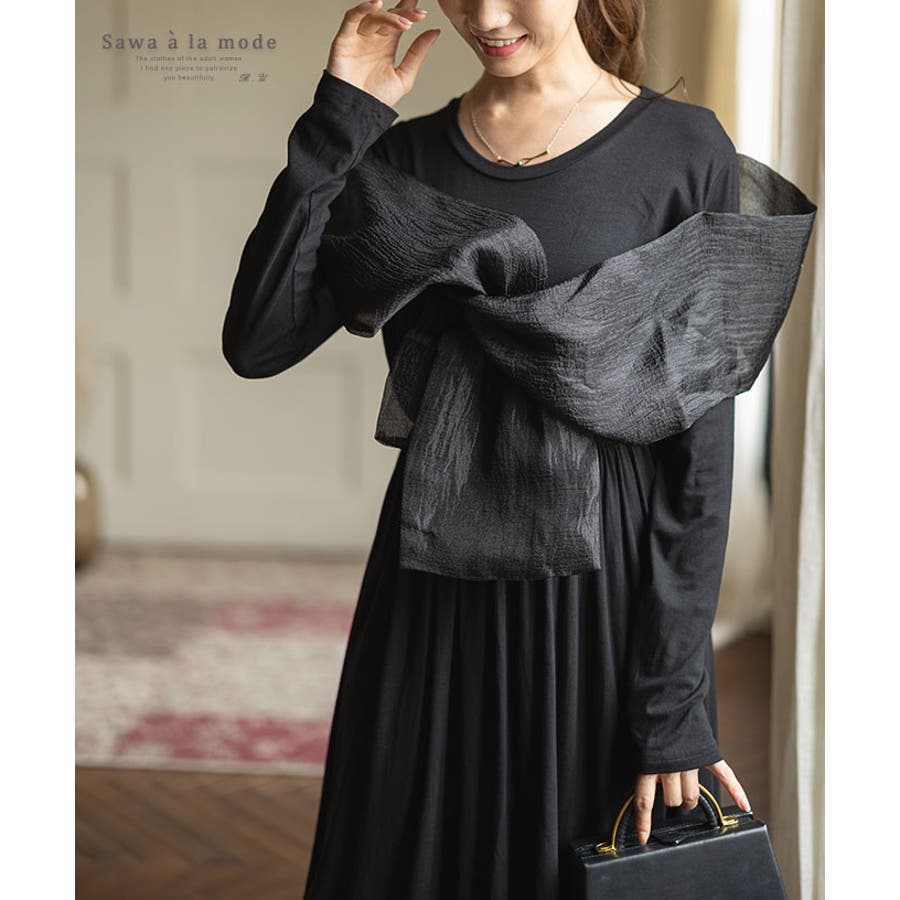 着丈は足首丈、袖丈は手の甲が隠れるくらいです。柔らかく伸縮性のあるカットソーで落ち感があり、楽な着心地でキレイなシルエットです。ウエストはゴム入りです。肩後ろ部分から縫いつけられたストール風生地がふんわり立体感があり印象的です。ストール部分は透け感・シワ感・少し光沢感があり、ワンカラーですが異素材の組み合わせがステキな1枚です。