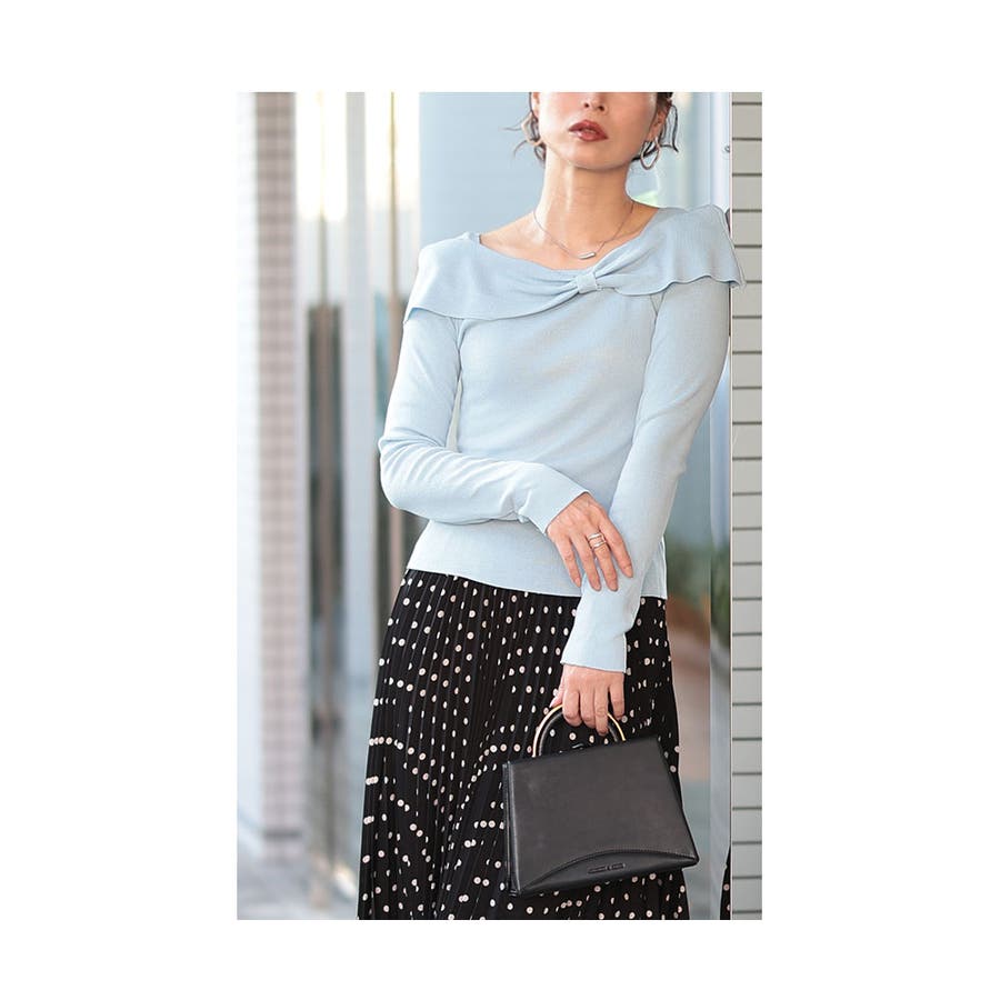 デコルテ美人見えなリボンカラーニットトップス。