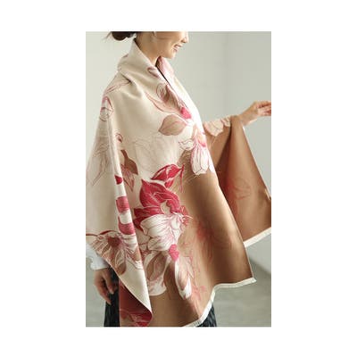 大きく花柄がデザインされた大判ストールです。ふわりとやわらかい肌触わりの生地で、優しく包み込んでくれます。全体へ大胆に描かれた花柄は線画のようなタッチで上品なデザインです。両端は繊細なフリンジのようになっています。一気にコーディネートの華になる素敵なストールです。