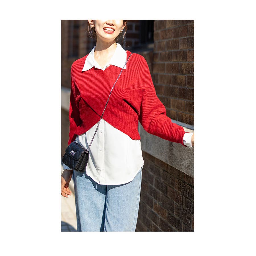 ニット着丈前はバスト下、後ろはウエスト丈です。温かみのあるニットでカシュクール仕立て、色々なコーデを楽しめそうです。シャツ着丈はヒップが隠れるくらい、袖丈は手の甲に少しかかるくらいです。程よいゆとりとストレッチ性がありサラッとしていてやや透け感があります。パンツ丈は床につくくらい、ウエストはゴムは入っておらずジャストサイズでした。脚のラインを拾わないやや太めのストレートです。