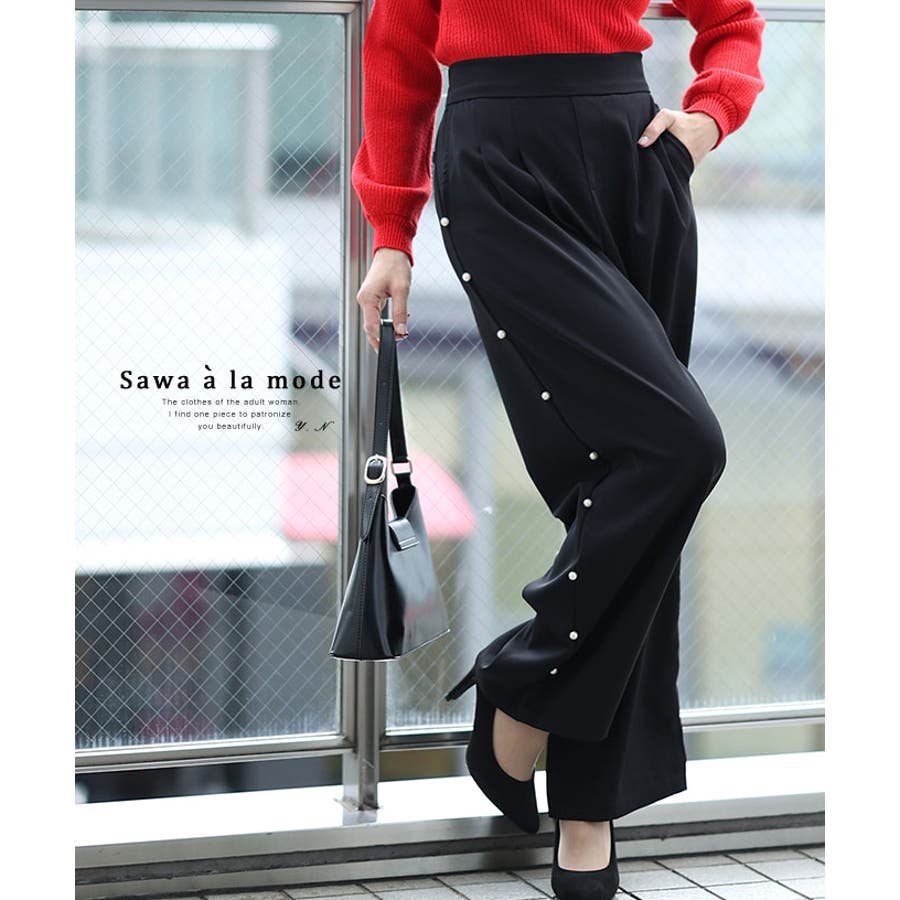 艶めくサイドパール付きやみつきワイドパンツ レディース ファッション