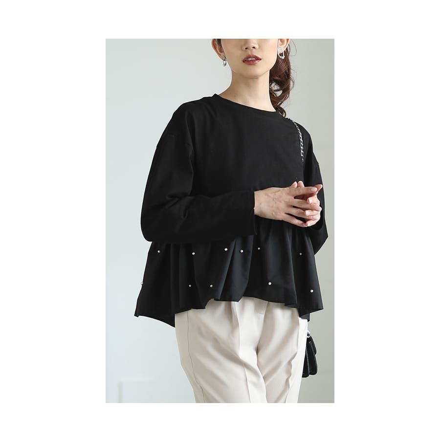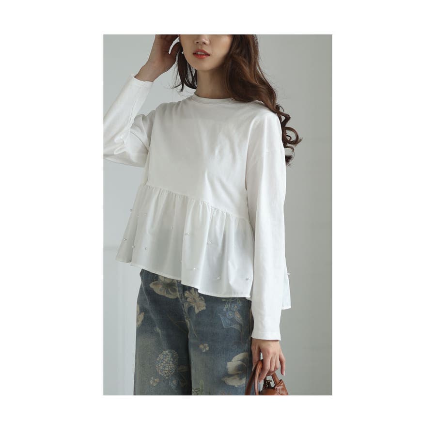 着丈はおへそと脚の付け根の中間くらい、袖丈は手の甲が半分隠れるくらいです。程よいゆとりのコットンの長袖Tシャツを、バスト下からシャツ生地でペプラムデザインに切り替えたトップスです。ペプラム部分にはパールが散りばめられ、ウエスト周りをカバーしながら華やかな雰囲気も楽しめます。ボトムとのバランスが取りやすい丈感で、色々なボトムとのコーデを楽しめます。
