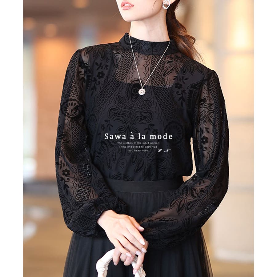 異国情緒溢れるオリエンタル柄フロッキープリントシアートップス。チュールにオリエンタル模様のベロアを重ねたデザイン。シアーな透け感が程よい抜け感を与えてくれます。ふんわりとしたお袖が大人の可愛さを演出。身幅はゆったりめでストレスフリーな着心地です。