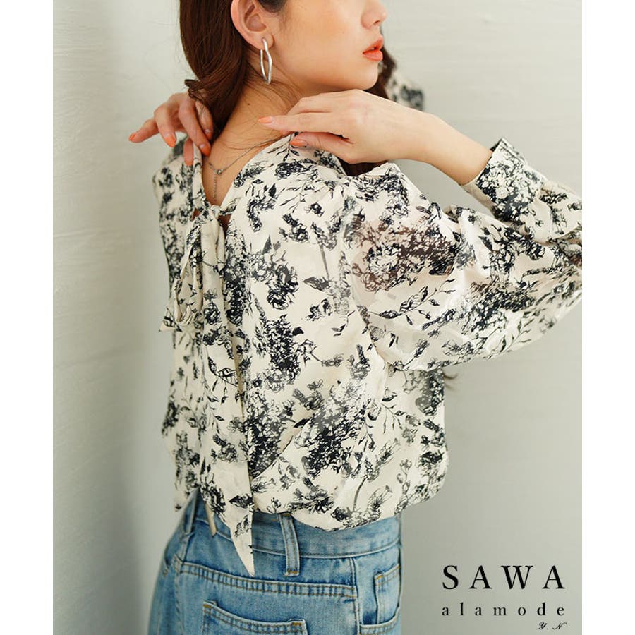 バックリボンが目を惹くボタニカル柄シアーシャツブラウス レディース ファッション