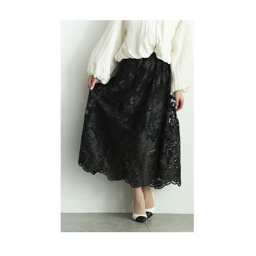 エレガントな柄が浮き立つ刺繍ベールのチュールフレアスカート。