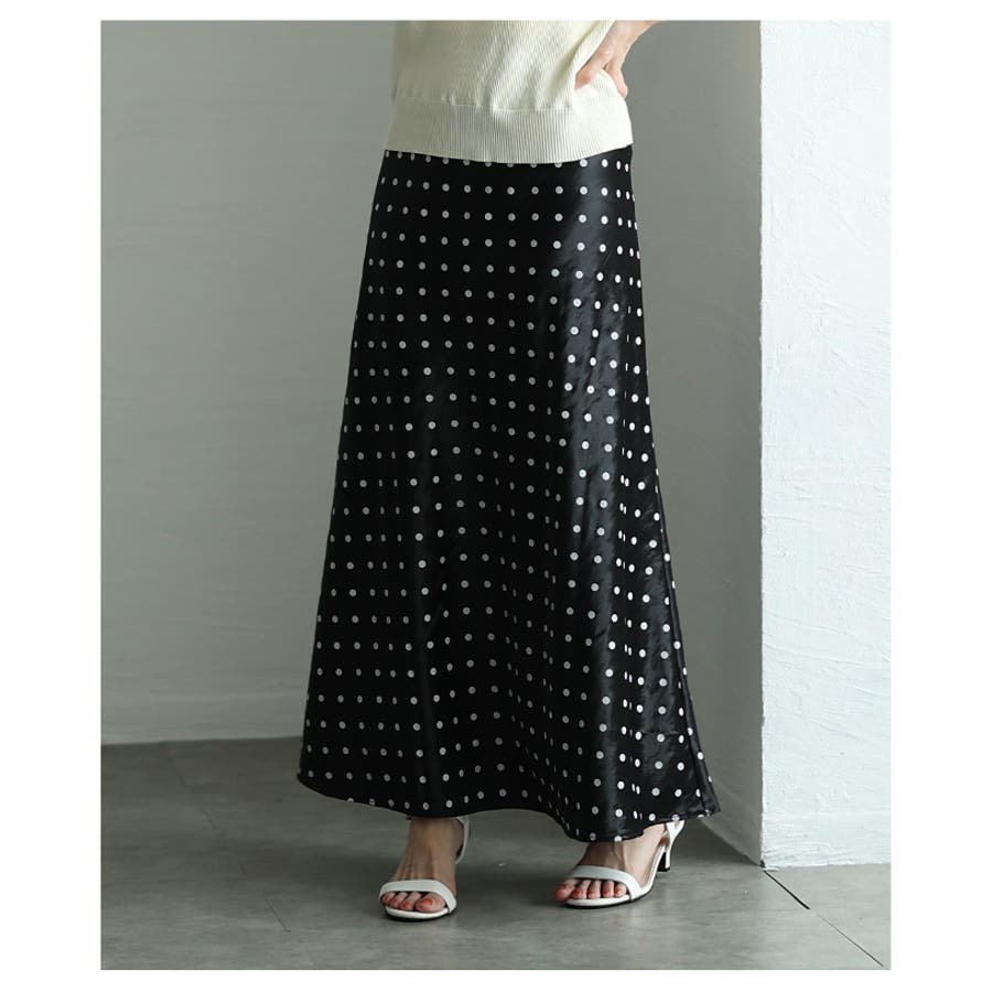 リュクスな雰囲気に包まれる艶サテンドットフレアスカート。