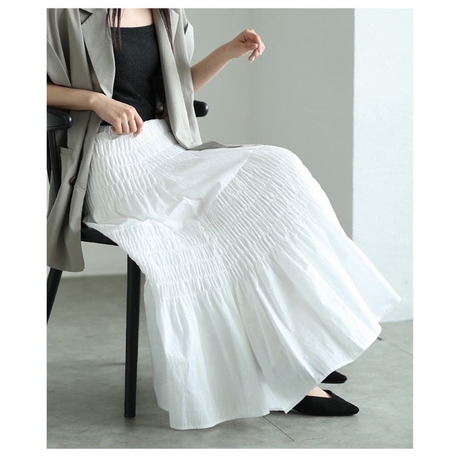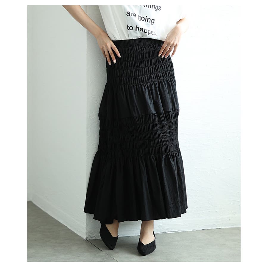 ふわりと弾む2段シャーリングフレアロングスカート。