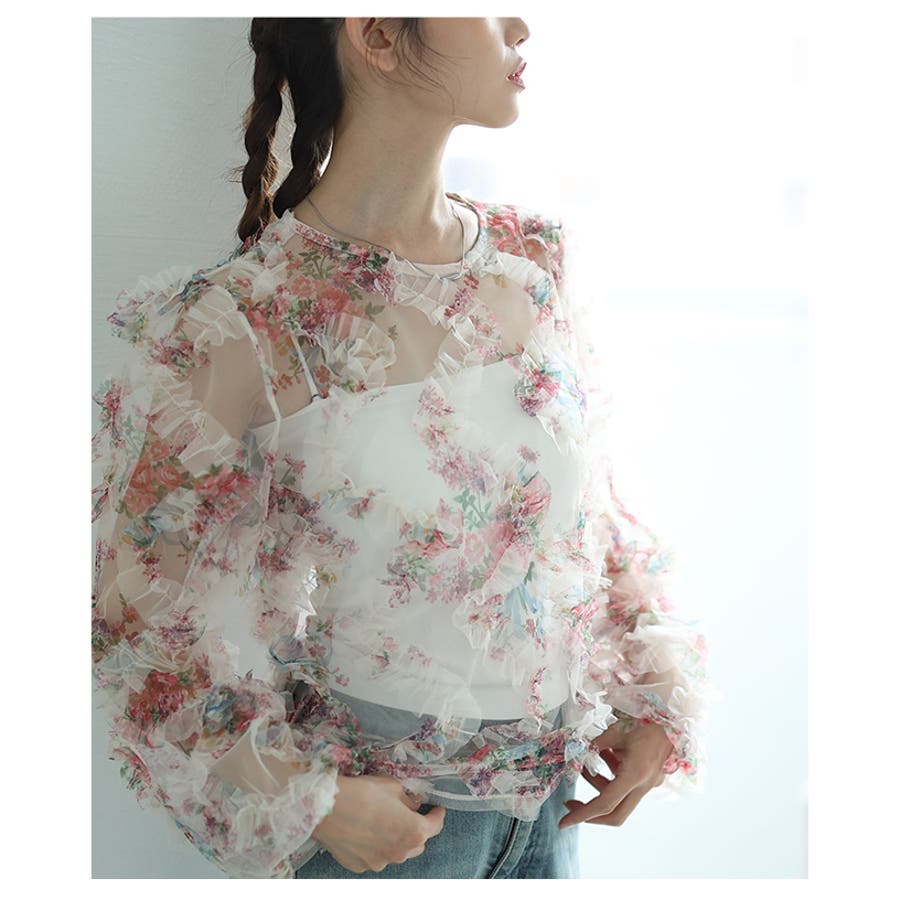 艶やかなヴィンテージフラワーが咲くシアーフリルプルオーバー。
