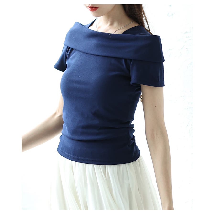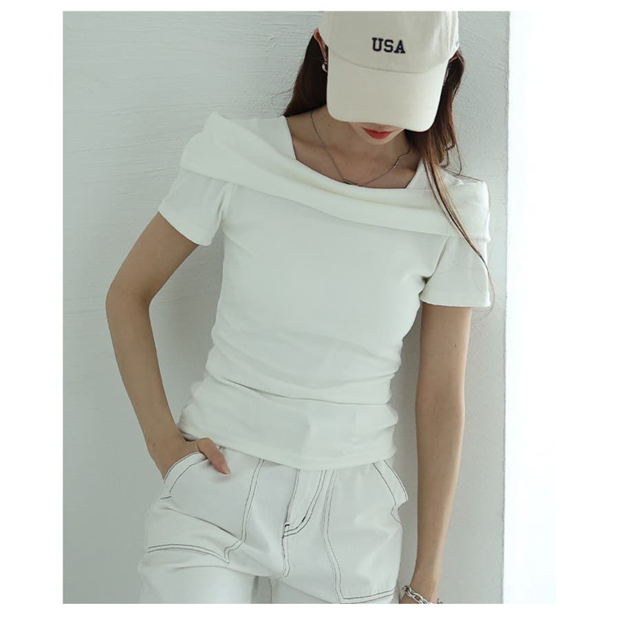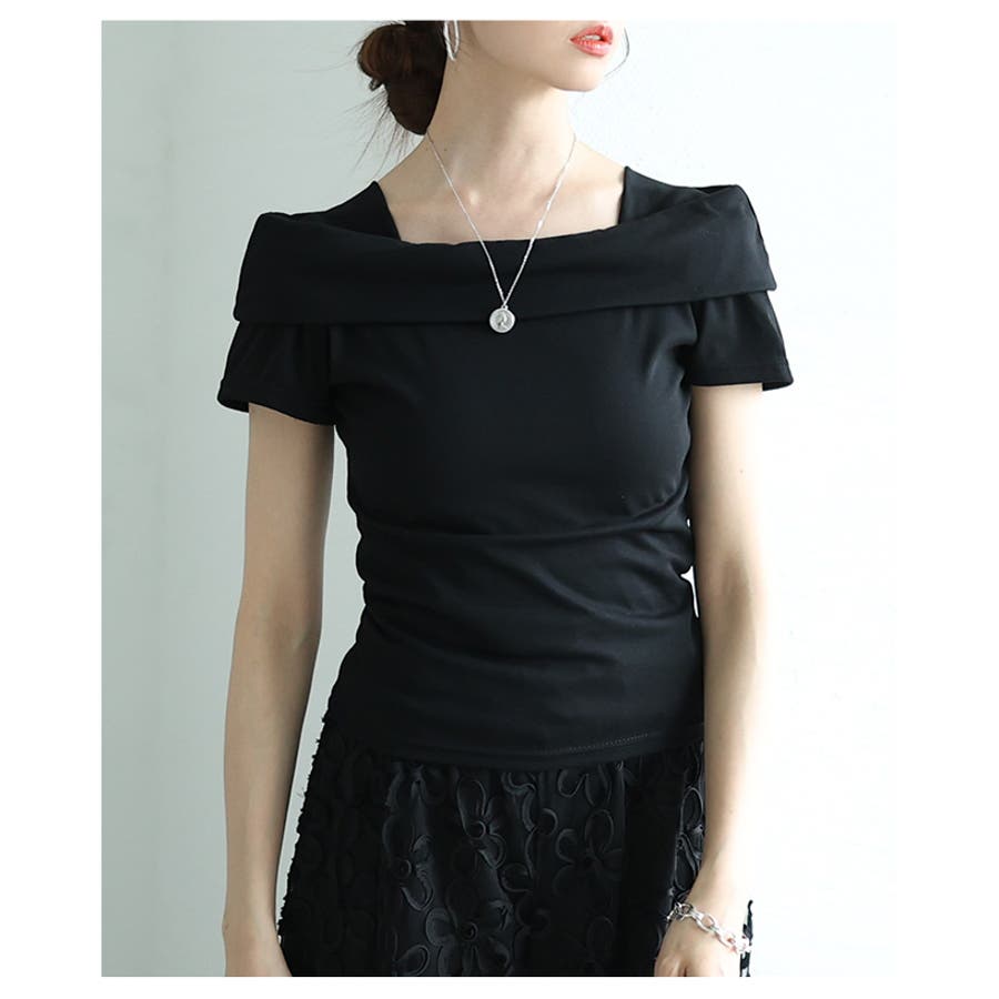 オフショルダーラップ風のネックラインが、ベーシックなカットソーをアップデートさせてくれるトップス。