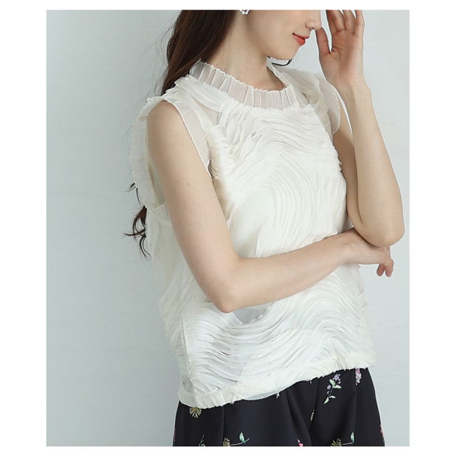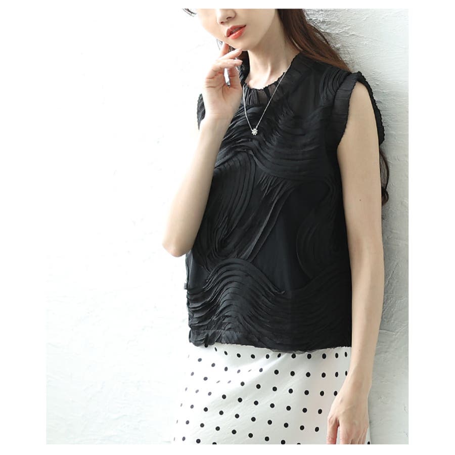 柔らかな女性らしさを惹き立てるチュールジャガードノースリーブブラウス。