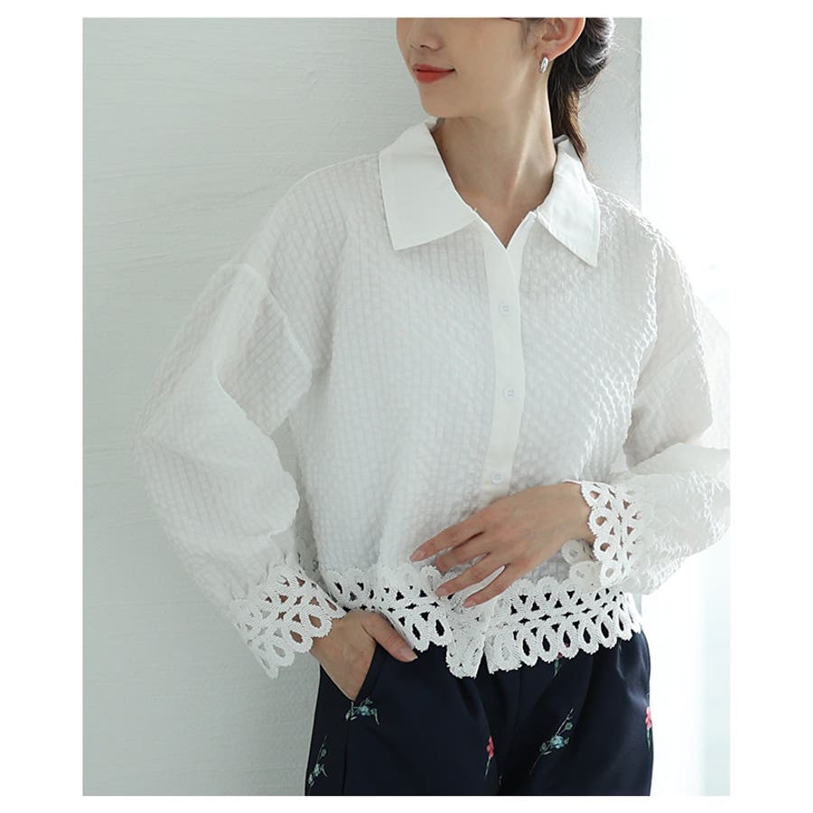 大人のこなれたお洒落を愉しむレース切替エンボスデザインショートブラウス。
