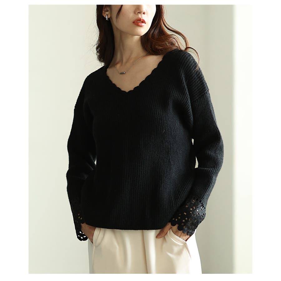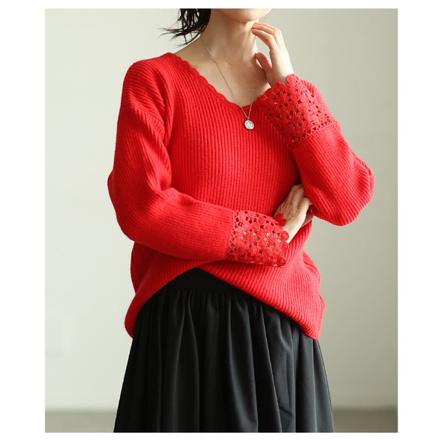 手元に浮かぶ袖口レースリブニットトップス レディース ファッション