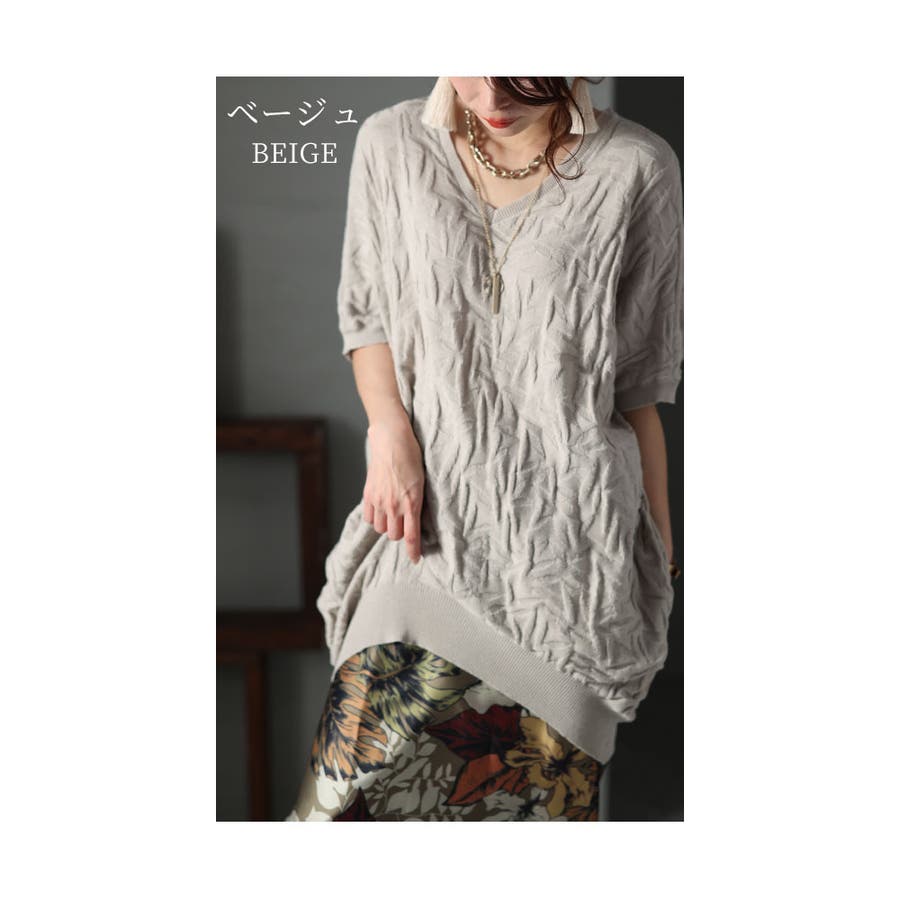 着丈は長い部分は太もも真ん中くらい、短い部分はまたした5cmくらいです。首元はVネックで屈んでも中は見えませんでした。袖は肘が隠れるくらいです。ドルマンスリーブで身幅も脇グリもとても余裕があり楽に着用出来ました。裾が絞られてるのでブラウジングもしやすくスカートコーデも合いそうです。立体的な編み模様や後ろの首元の抜け感が女性らしく柔らかい綿100%の生地で肌触りもとても良かったです。Mサイズ着用モデル