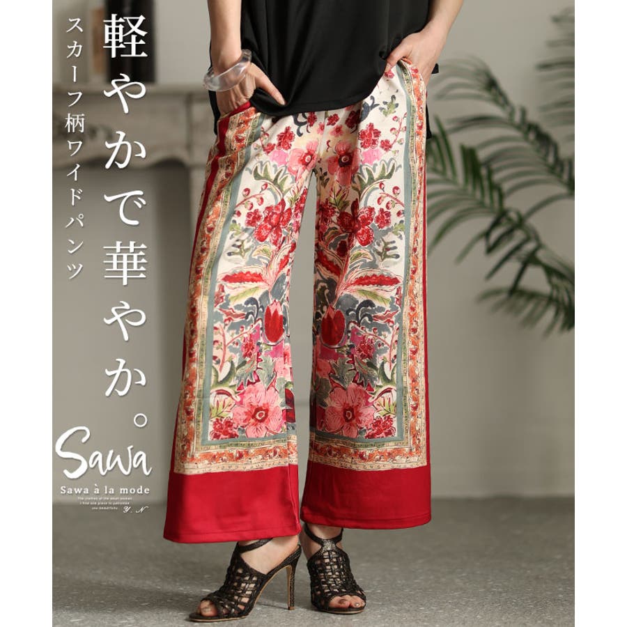 軽やかで華やかなスカーフ柄ワイドパンツ レディース ロング