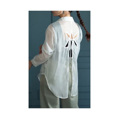 着丈はヒップがすっぽり隠れるくらい、袖丈は手の甲が半分隠れるくらいです。やや光沢感のあるシアー素材で、透け感があるのでインナーが必要です。フロントはシンプルですが、背中に花型のカッティングとリボン、深めのスリットが入っていてバックコンシャスな一枚です。