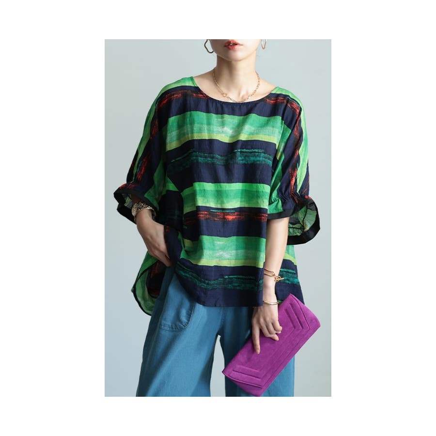 特徴: ボーダー 水彩風 手書き風 フレア 変形 キャンディースリーブ 配色 バイカラー コットン 綿 タック