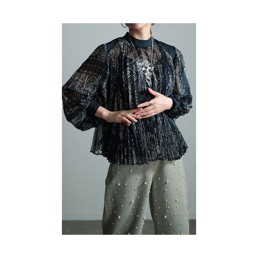 贅沢なプリーツ生地にペイズリー柄が重ねられ、品ある雰囲気を演出するプルオーバーブラウス。