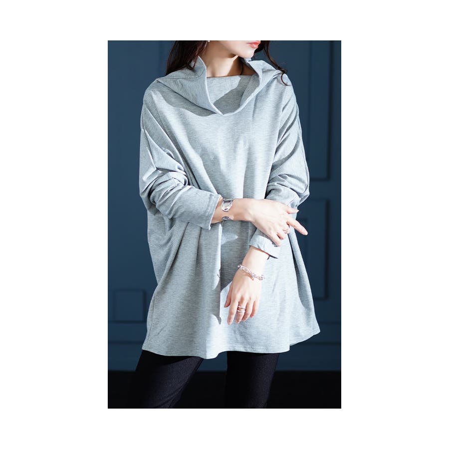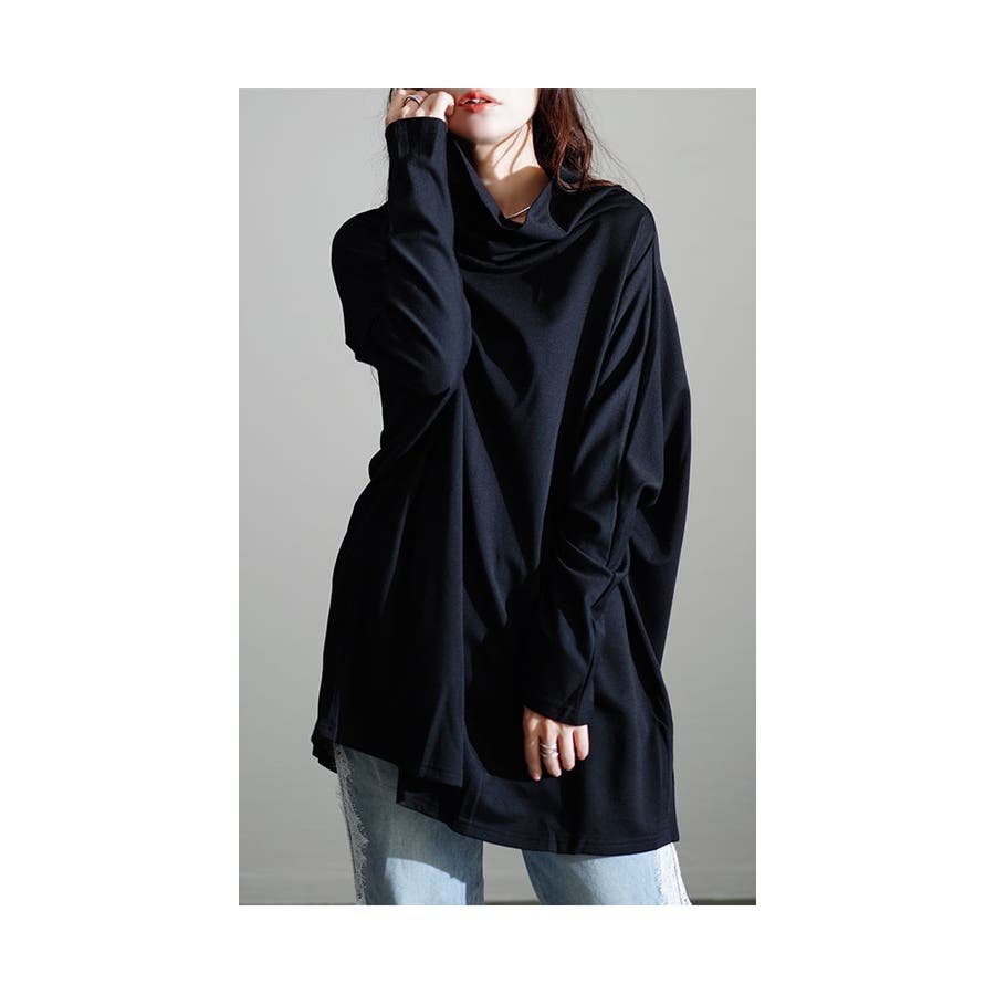 着丈は太もも丈、袖丈は指先が少しのぞくくらいです。コットン混の程よい厚みのカットソーで、伸縮性があり、ドルマンスリーブ&ビッグシルエットのゆったりした着心地でした。首元はオフタートルでゆったりしており、重ね着でインナーをのぞかせてもアクセントになっていいですね。