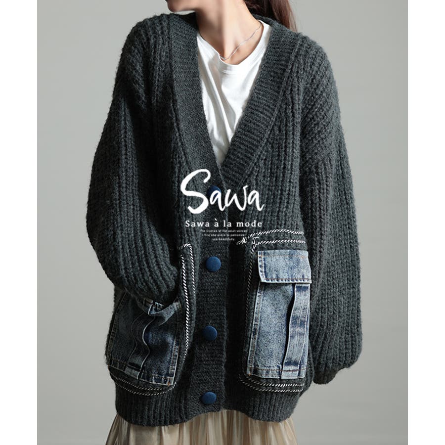 特徴: 異素材 リブニット デニム ポケット パイピング ざっくりニット ボタン