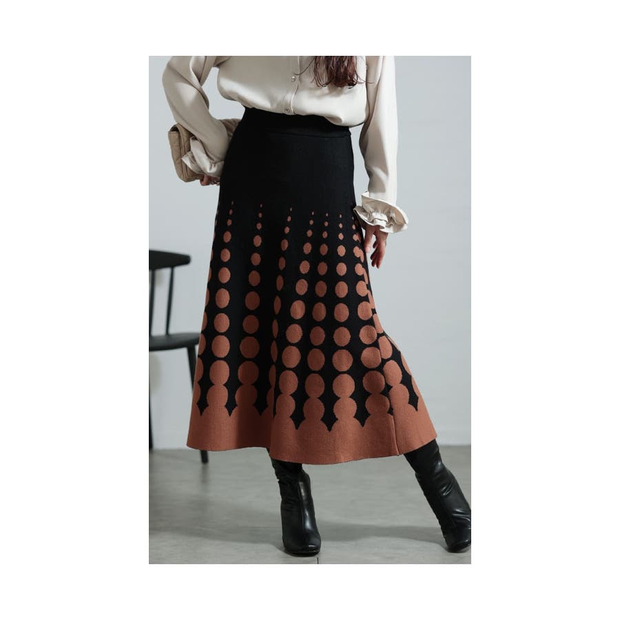 上品なAラインを描くフレアなシルエットで大人っぽさを加速し、伸縮性のあるニット生地で季節感を彩ります。流れる様な水玉模様が穿くだけで表情あるシルエットに。長く愛されるトレンド柄を投入するだけで洒落感纏うスタイリングに仕上がります。