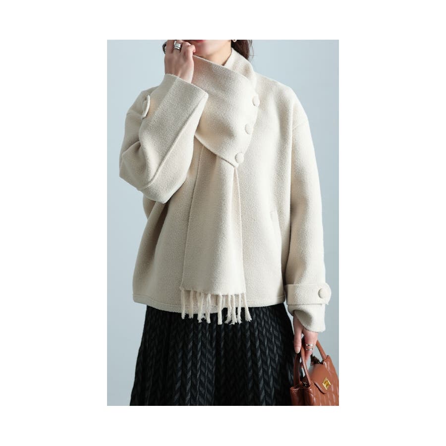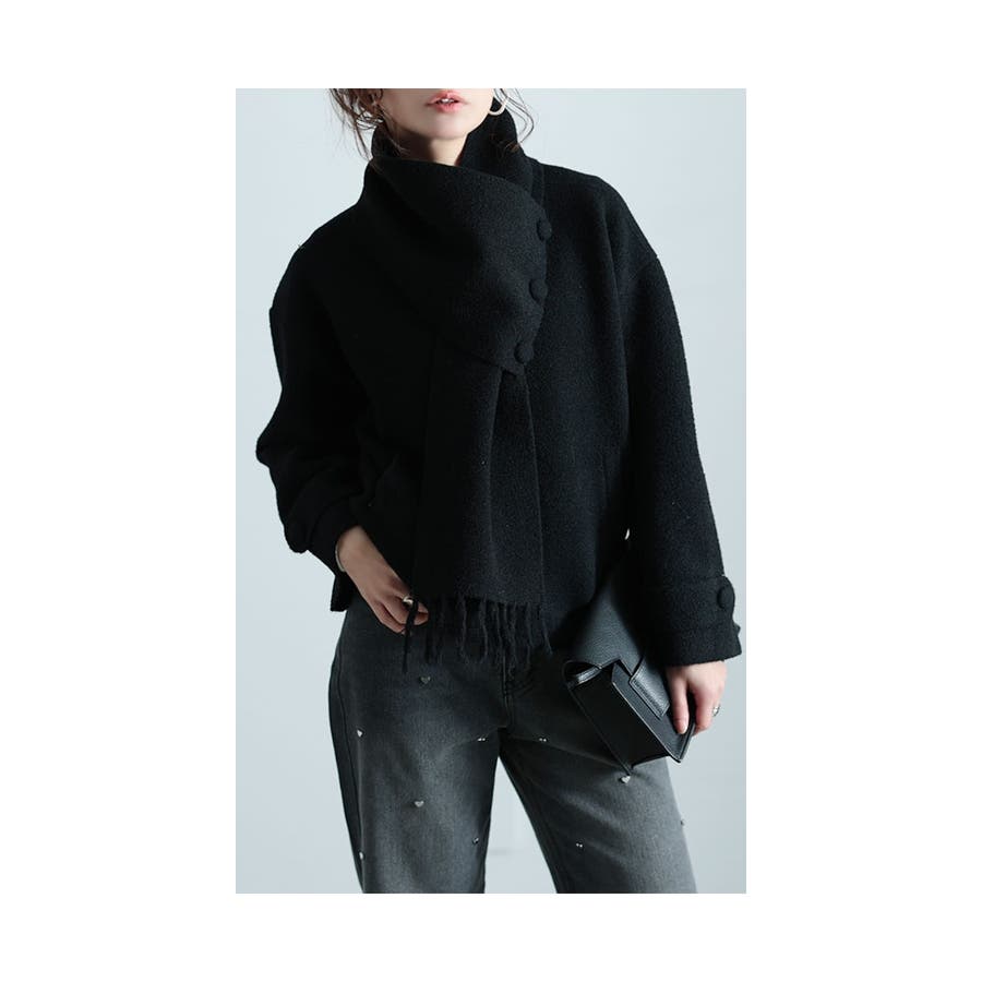 ころんと大きなボタンがアクセントに。モタつきの無いすっきりとした丈感で脚長効果にも。すっきりとした丈だからボトムスを選びません。両サイドにポケット付きで利便性にも長け、カーディガンとマフラーで同素材で統一感を演出し、気温によって取り外しが出来るから何かと便利。カーディガンだけでも、ドッキングでも楽しめる大人なカーディガンです。