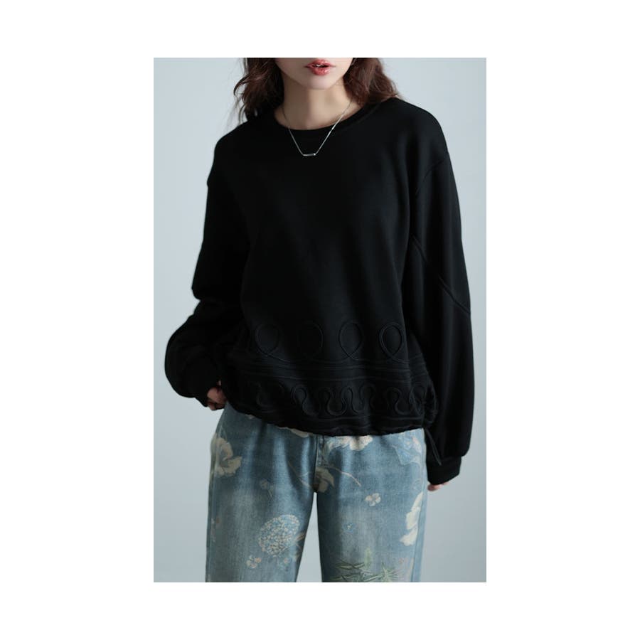 特徴: コード刺繍 ライン クルーネック ドロスト