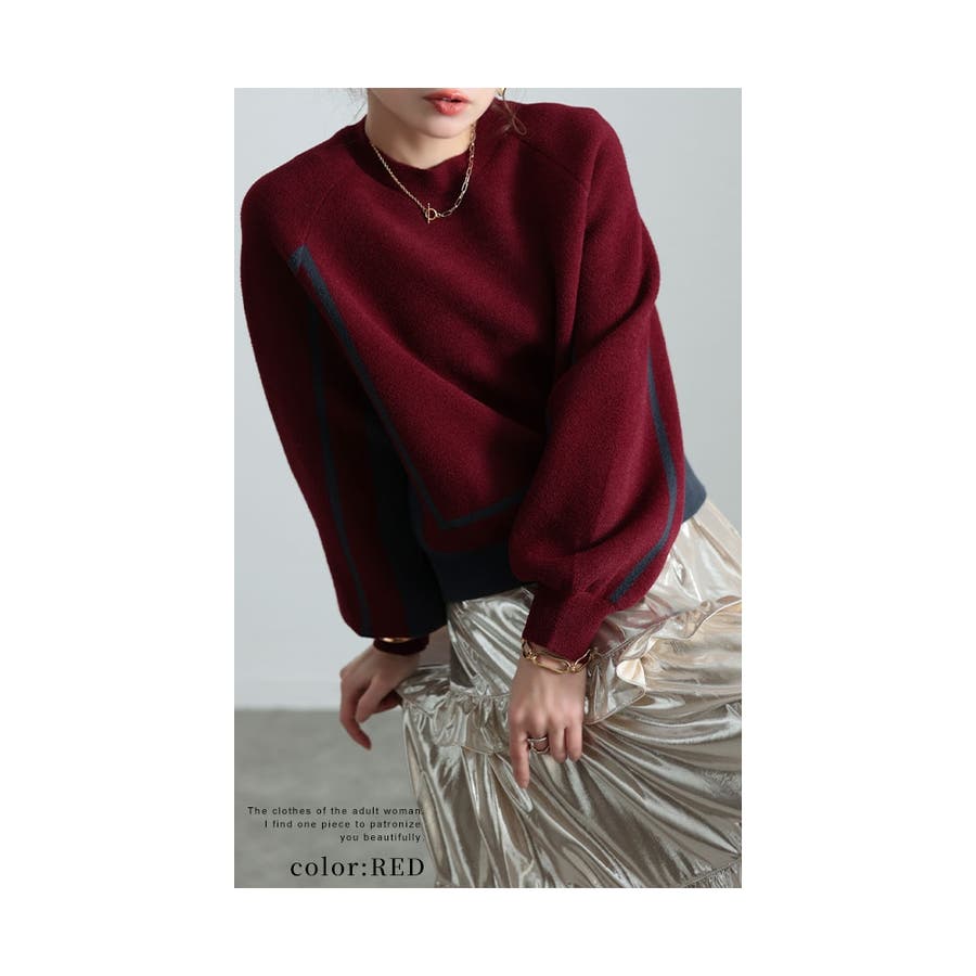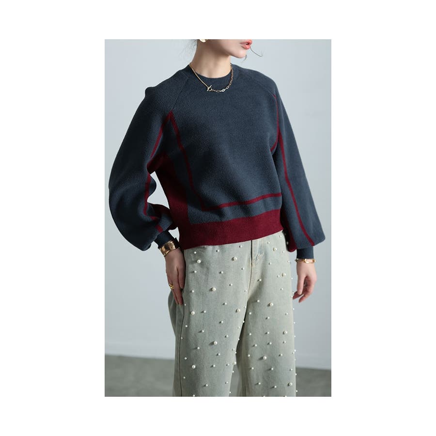 特徴: 配色 ライン クルーネック ニット 着痩せ リブ