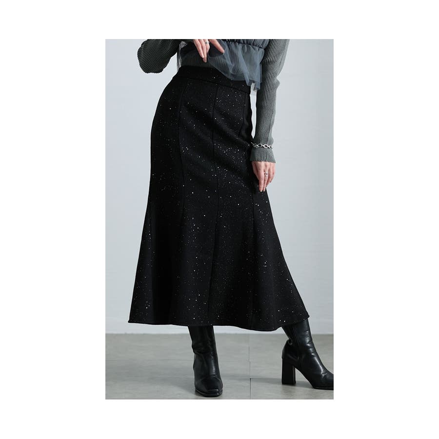 大小の異なるラメが散りばめられたニットスカートは、まるで星屑のような煌きが輝き、リッチな装い。