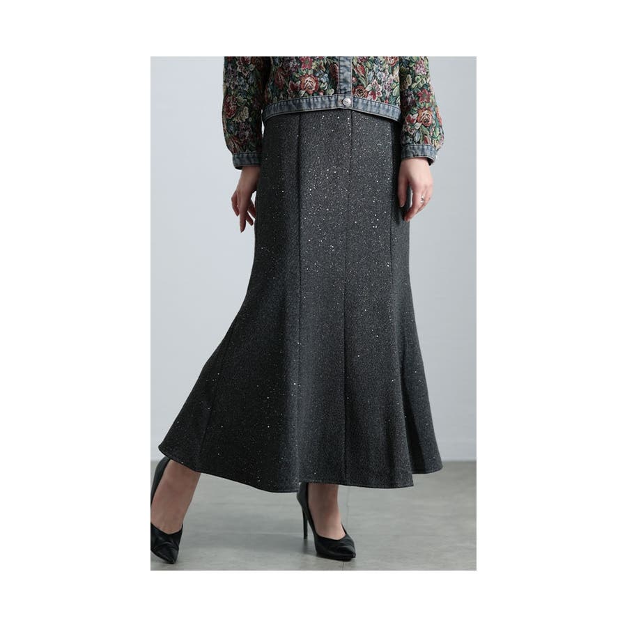 ラメの煌きが季節を盛り上げる秋冬のトレンドアイテム。ニット地で伸縮性にも優れ、屈んでも窮屈感なく、動きやすさをサポート。品のある丈感で脚長効果も期待できるスカートは、お呼ばれなどの特別なシーンにも馴染みます。