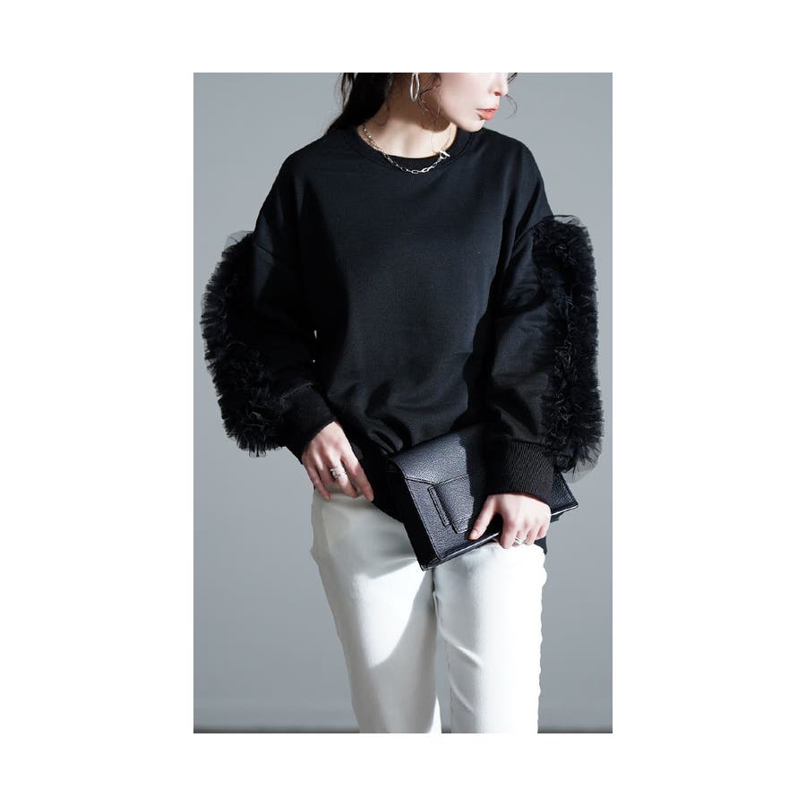 特徴: 異素材 チュール フリル スウェット 裏毛 ボリューム袖 クルーネック