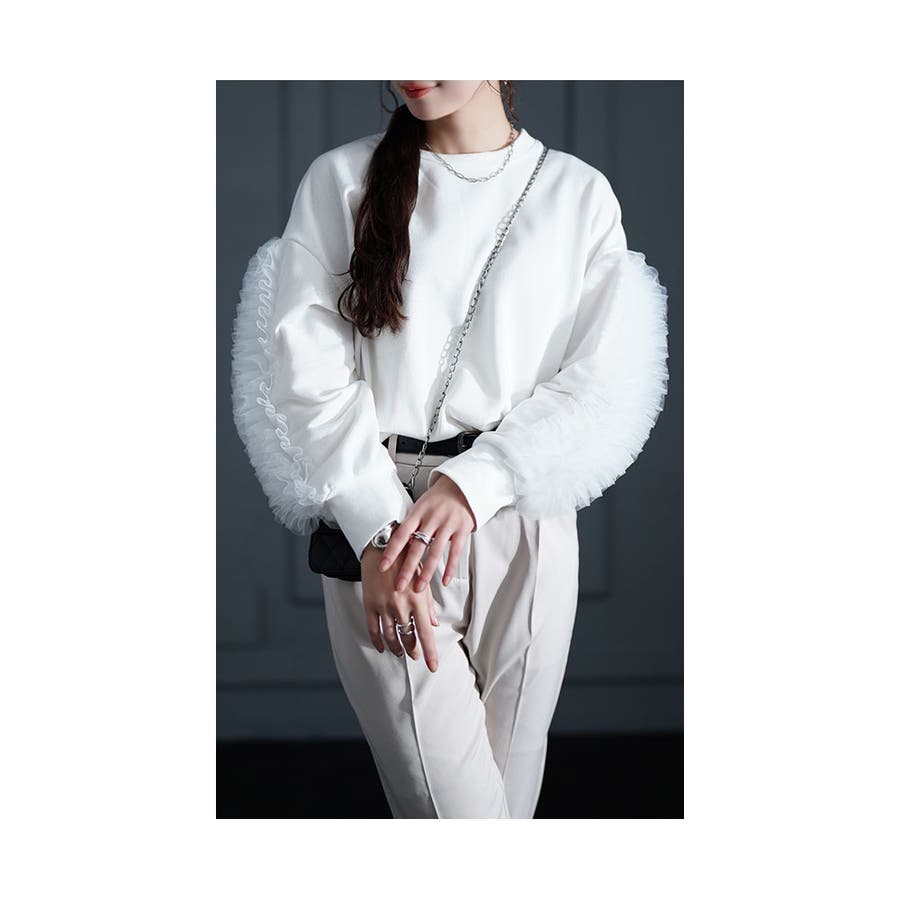 スリーブに配された、チュール地のたっぷりフリルが印象的。いつものスウェットプルオーバーを、レディ感溢れるシルエットに昇華します。クルーネックの首元は、ハイネックインナーとの相性も抜群。シアー素材のインナーを仕込めばトレンド的スタイリングに。
