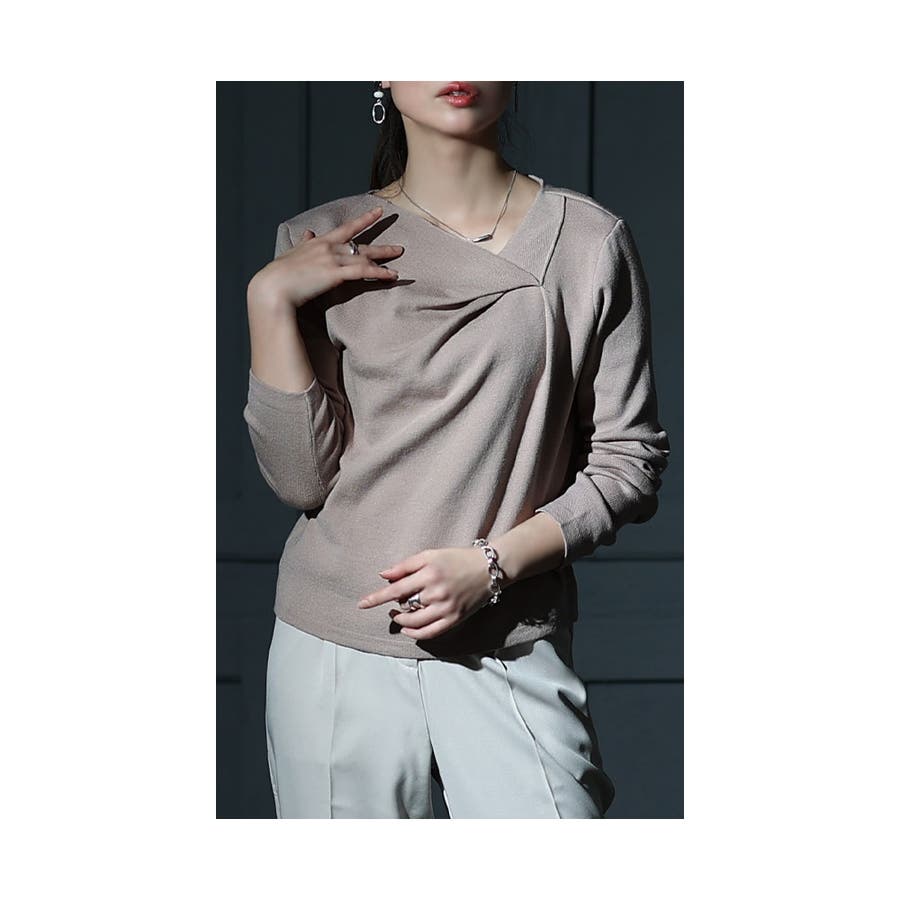 アシンメトリーネックの首元がこなれた印象を重ね、タックを寄せたヒトクセが効いたデザインが垢抜けスタイルに。お顔周りもすっきり見せ、大人っぽさを演出させながら首長効果にも。