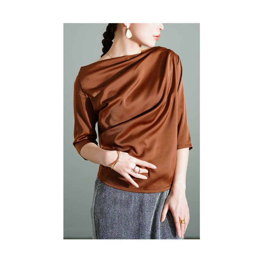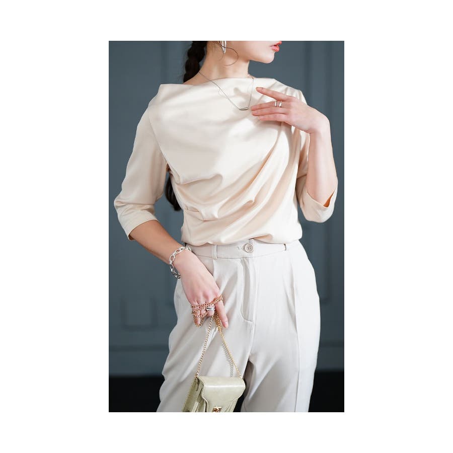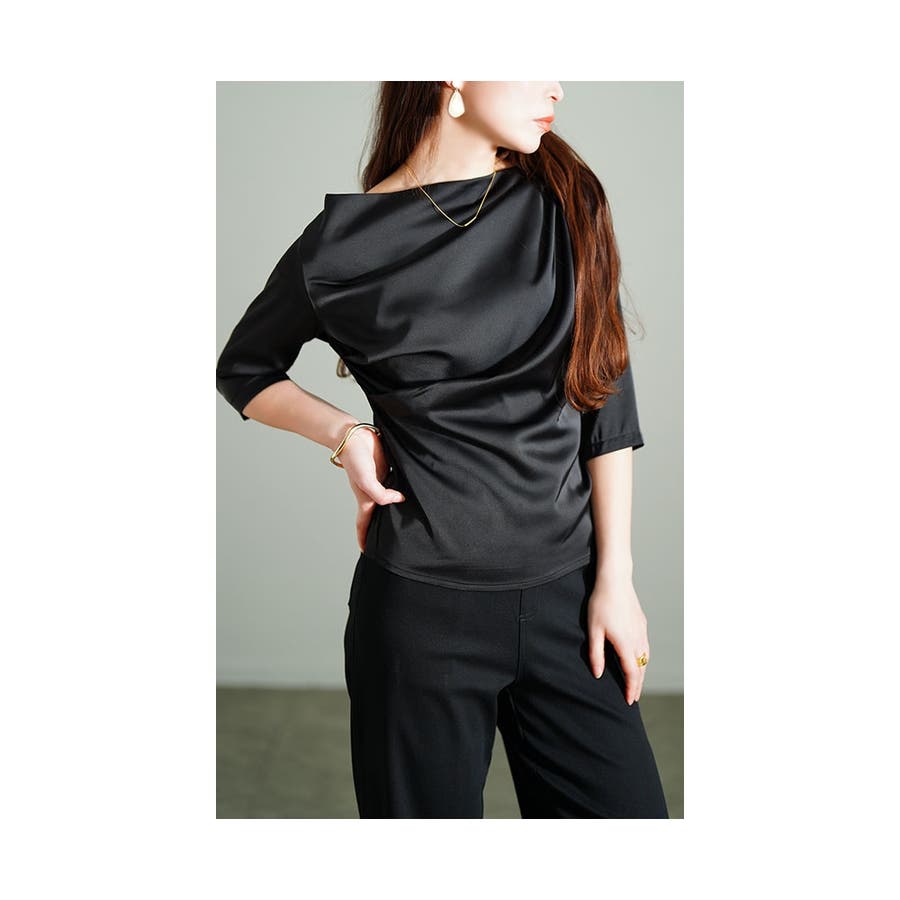 幅広のボートネックは体型を選ばす、デコルテ部分の露出が少なく上品ながら可愛らしさがあり、他のウェアにも合わせやすいメリットがあり、ドレスアップするようなシルエットで気品ある印象に。左肩と右脇にタックが仕込まれ、流れる様なドレープでシルエットに奥行きをプラスし、光沢感ある生地が重なることで、リッチなスタインリングに仕上がります。