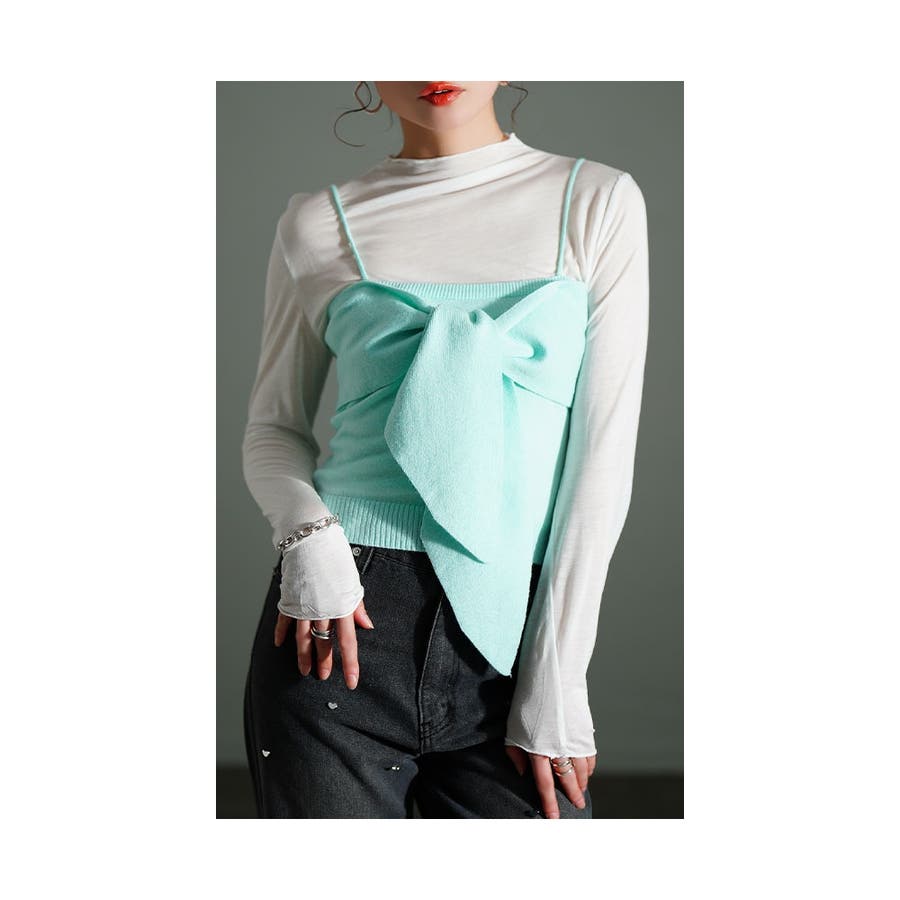 少し立ち上がりのあるボトルネックのカットソーは、ハイネックよりお顔周りをすっきりさせつつ、きちんと感を演出。軽やかな着心地の薄手のカットソーだから、重ね着にもぴったり。ニット地のビスチェ風のキャミソールは、胸元に大きなリボンを結べるデザインで、華やかさをアップデート。結び方をアレンジしたりと、胸元に女性らしい彩りを加えます。
