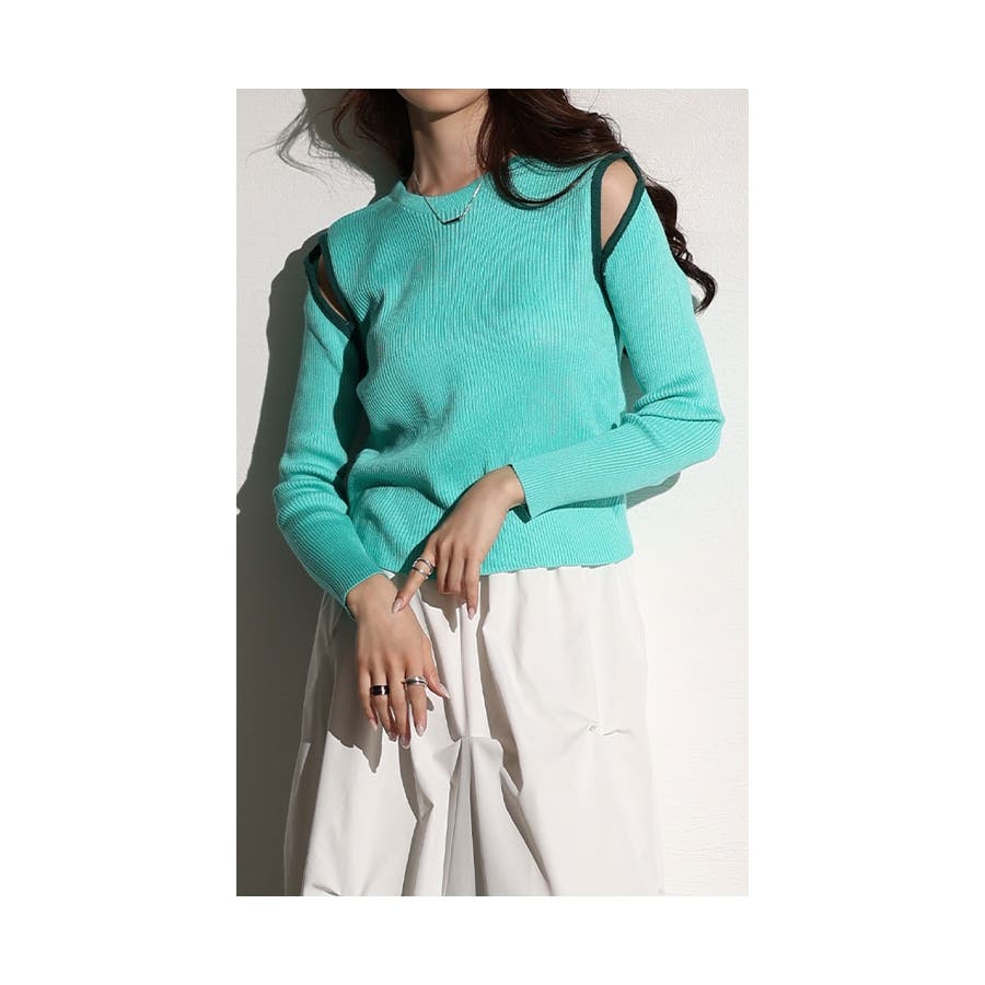 特徴: カットアウェイショルダー オープンショルダー パイピング リブニット 配色 クルーネック