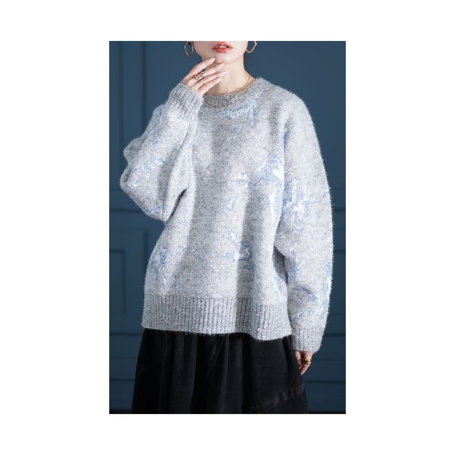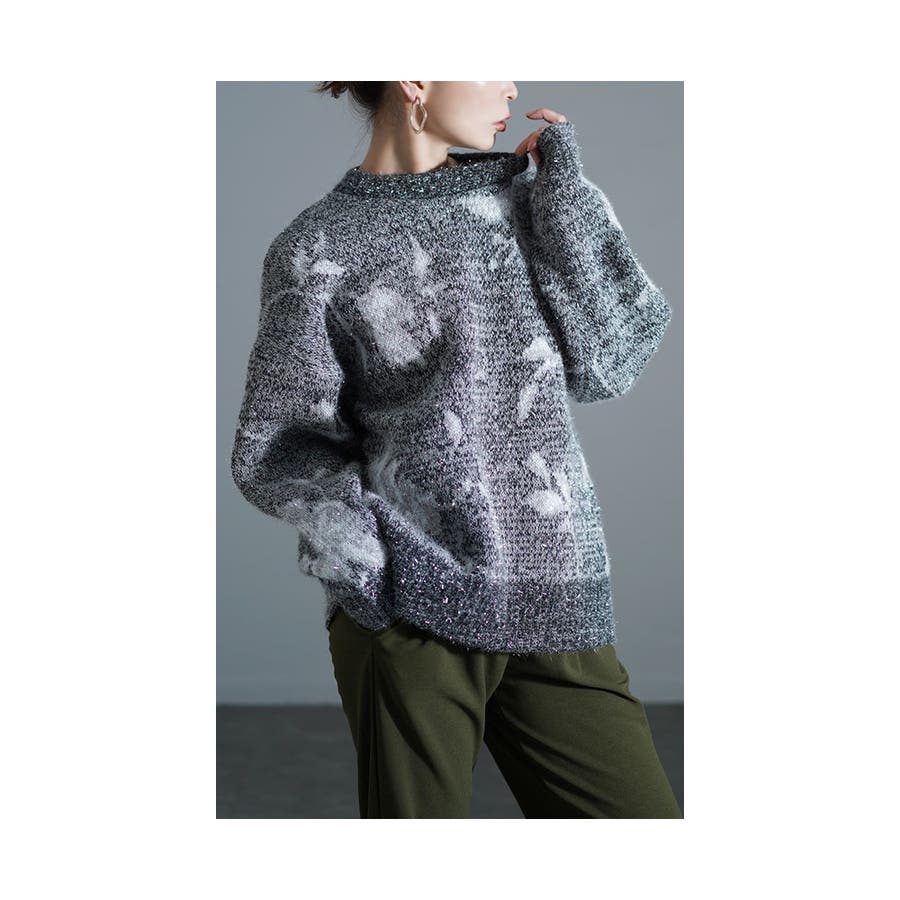 絵画のような花柄に煌めくラメシャギーが重なり、高見え効果を発揮するニットトップス。