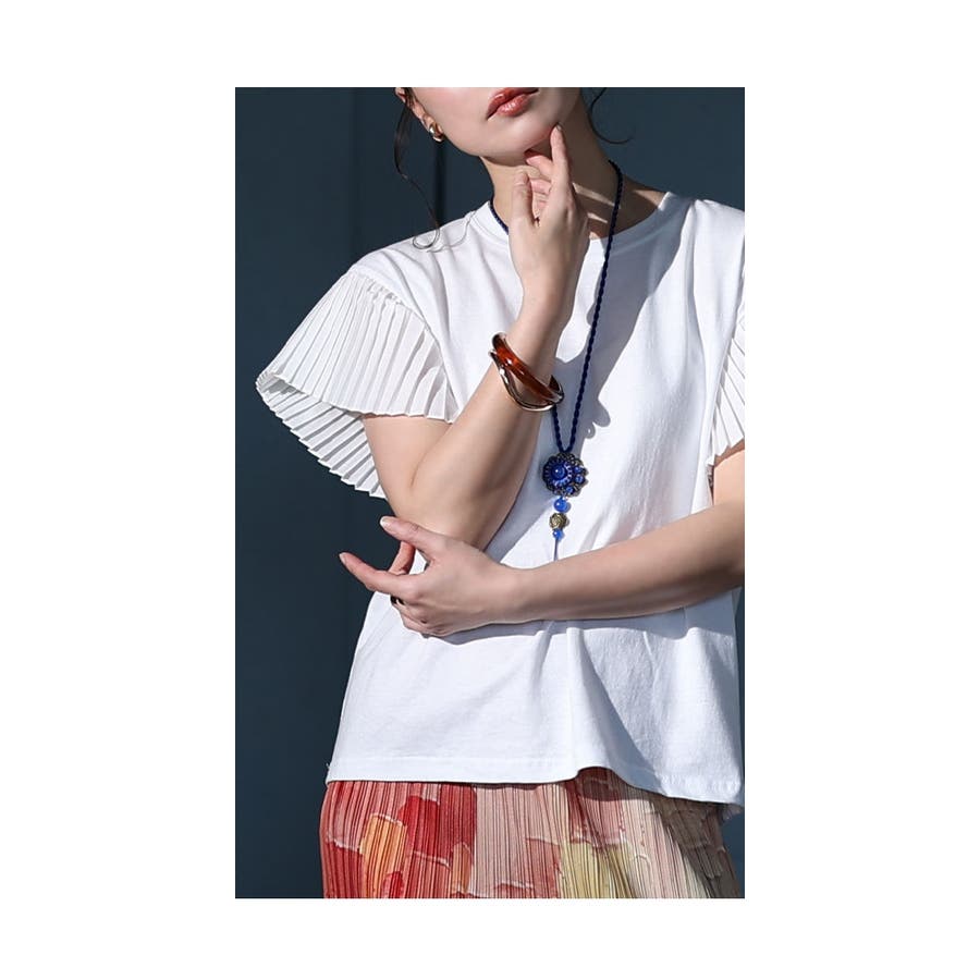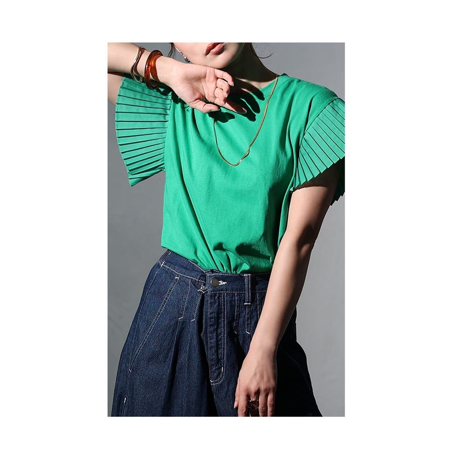 スリーブにたっぷりのアコーディオンプリーツが華やかさを彩り、ロマンティックな印象が宿るトップス。プリーツが揺れるたび、夏の爽やかな風を感じさせます。
