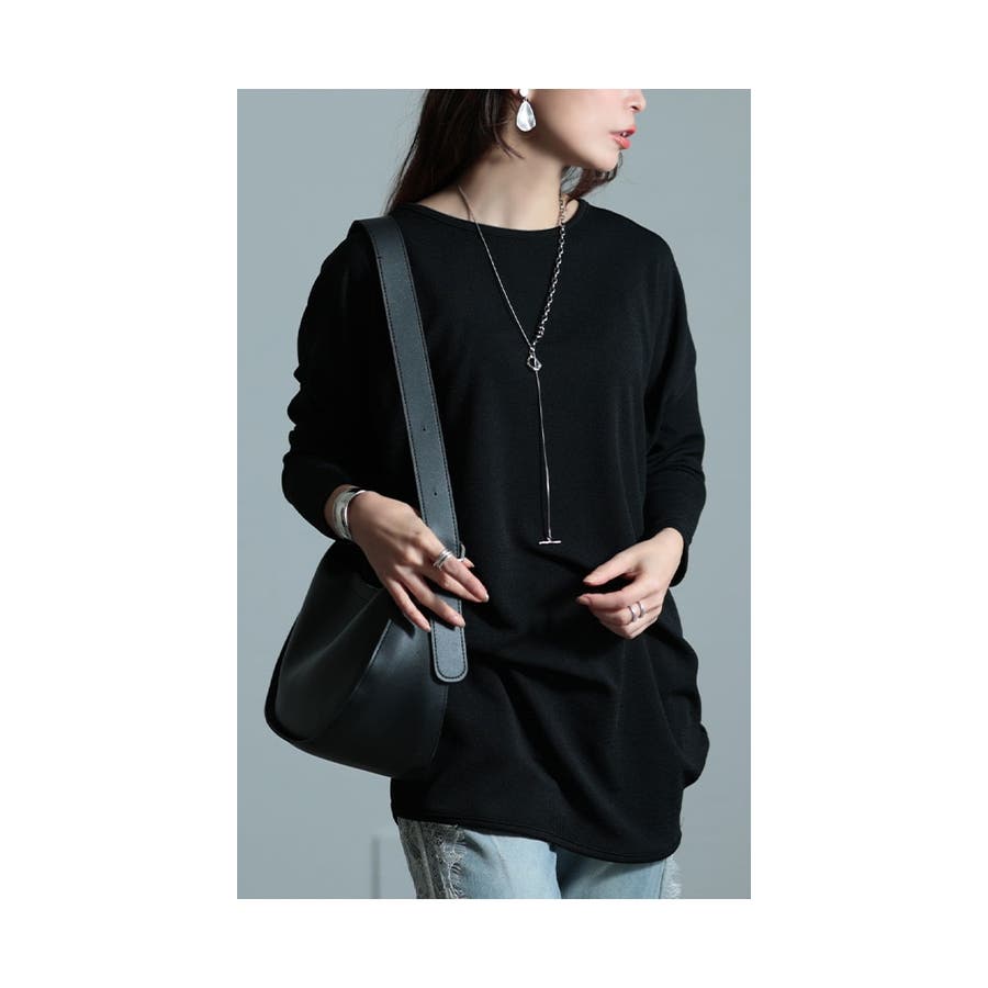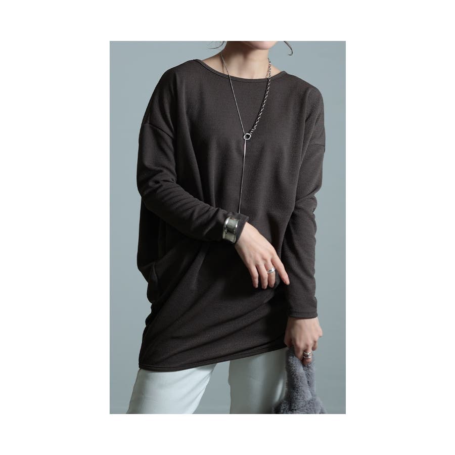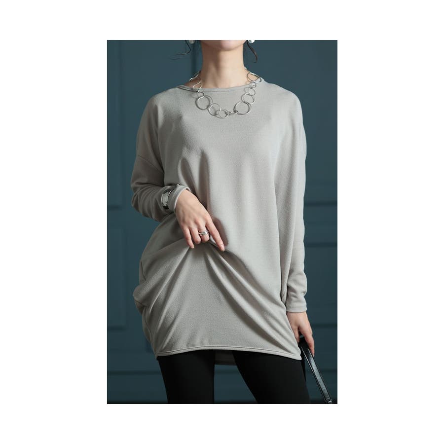 程よい開きのラウンドネックでレイヤードにも好相性。ふわりとボディラインを包み込むコクーン型に、長めの丈で太ももラインまでしっかりカバー。