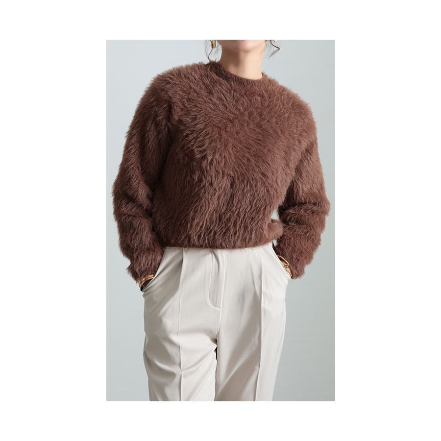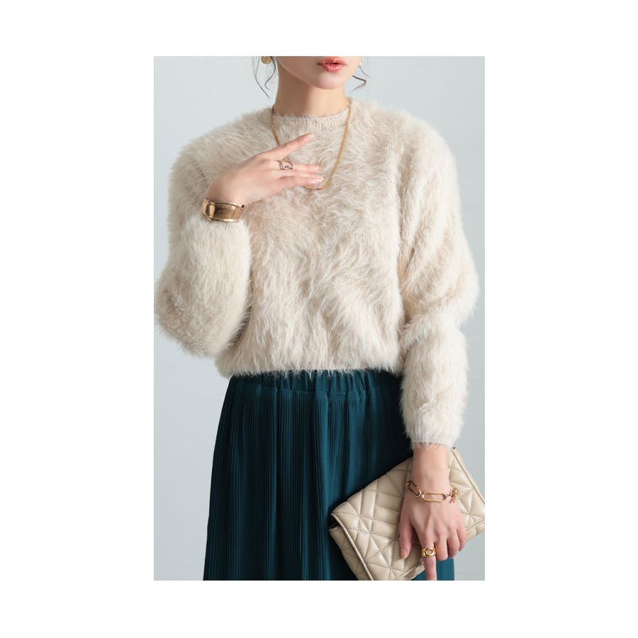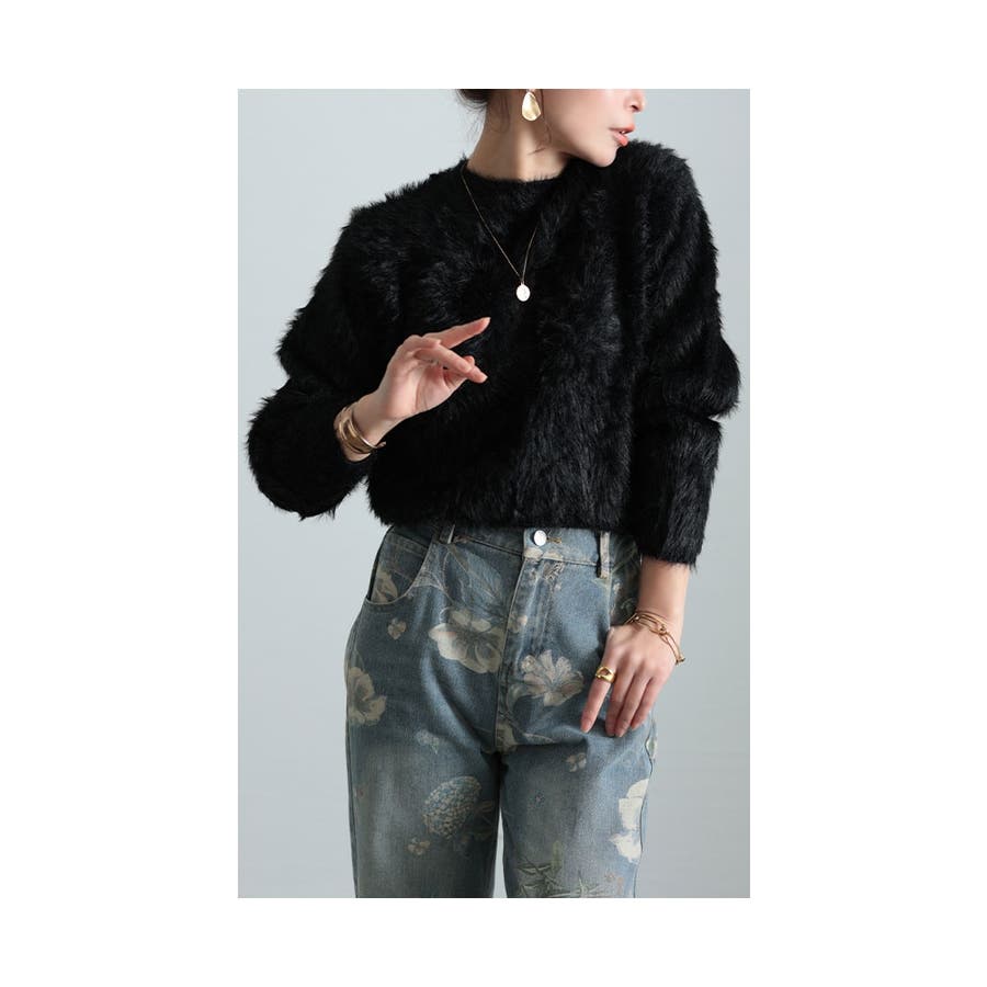 着丈はおへそ丈、袖丈はちょうどでした。毛足の長いファーのようなもふもふの手触りのニットです。チクチク感はありません。身頃・袖ともに程よくゆとりがあり、楽に着られました。首元はコンパクトめの丸首で、少し着脱に窮屈感がありました。ショート丈なのでボトムとのバランスが取りやすく、シンプルなデザインで使いやすい一枚です。